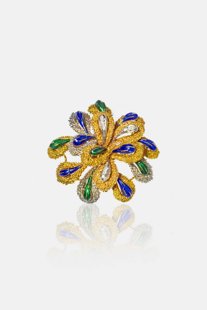 Peso gr 29 2 Cm 4 5x4 5 in oro giallo e bianco anni '50 con petali lavorati a corteccia ed impreziositi da smalti blu e verdi; diamanti taglio 8/8 per totali ct 0 10 ca