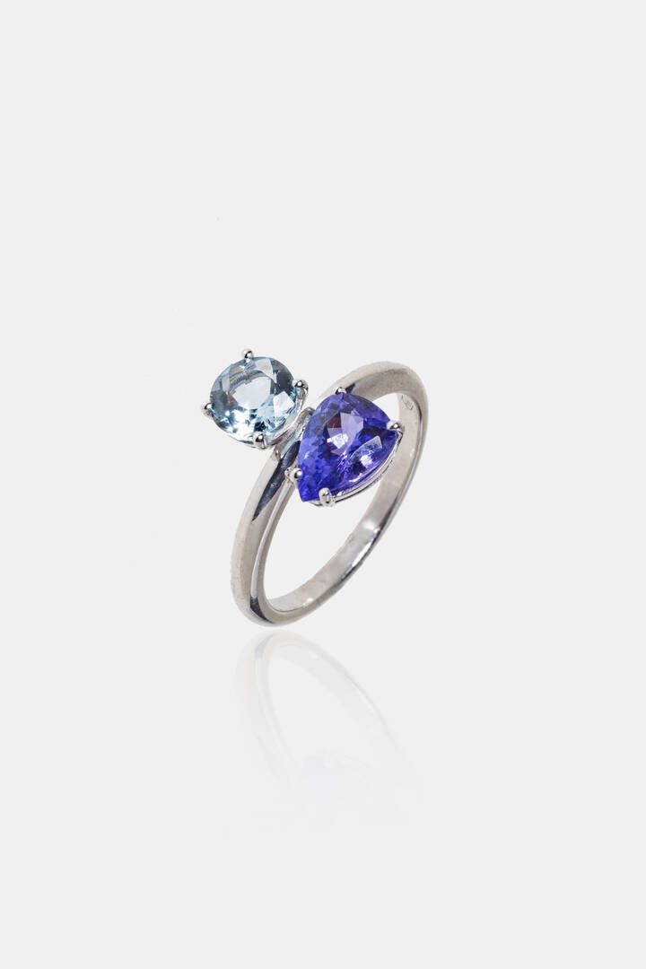 Peso gr 3 6 Misura 13 (53) in oro bianco con acquamarina taglio rotondo di ct 0 67 e tanzanite taglio a goccia di ct 1 0 ca