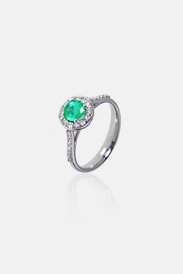 Peso gr 3 9 Misura 13 (53) in oro bianco al centro smeraldo taglio rotondo di ct 0 50 ca; contornato da diamanti taglio brillante per totali ct 0 30 ca.