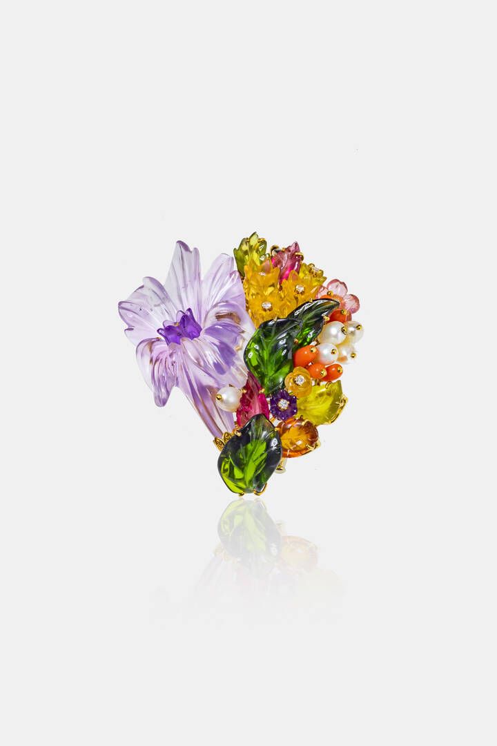 Peso gr 39 2 Cm 5 5x5 in oro giallo a forma di mazzo fiorito con ametista taglio a fiore coralli cromodiopside perle e quarzo citrino a decoro. Diamanti taglio brillante per totali ct 0 17 ca