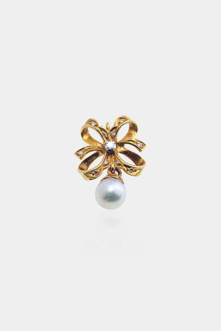 Peso gr 4 6 in oro giallo a fiocco con diamanti taglio 8/8 e brillante per totali ct 0 10 ca e una perlina giapponese pendente