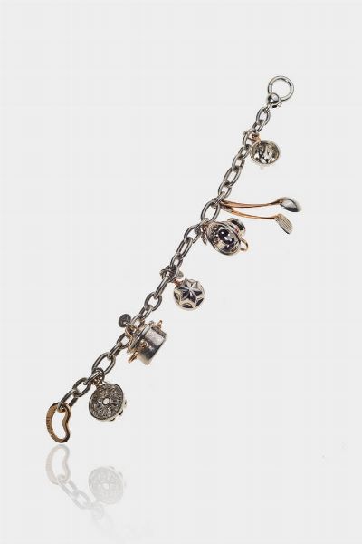 Peso gr 47 2 Lunghezza cm 18 Bracciale in argento 925 /1000 linea Dodo con sei charms pendenti in argento e oro 9 Kt raffiguranti uno scolapasta uno stampo per ciambellone uno stampo per budino una pentola un mestolo con spatola