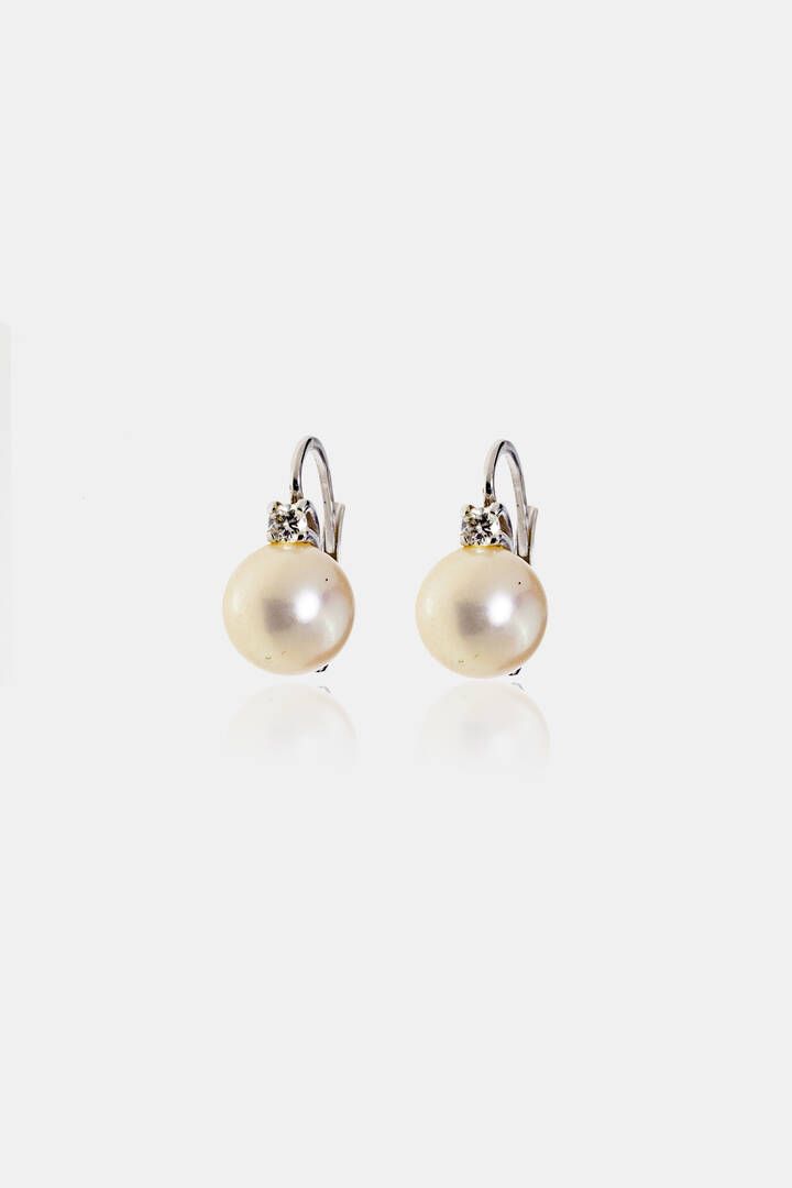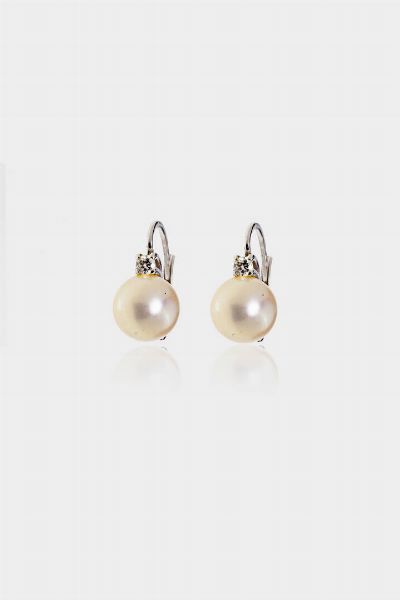 Peso gr 5 5 in oro bianco a monachella con due perle giapponesi del diam. di mm 9 5 e diamanti taglio brillante per totali ct 0 10 ca