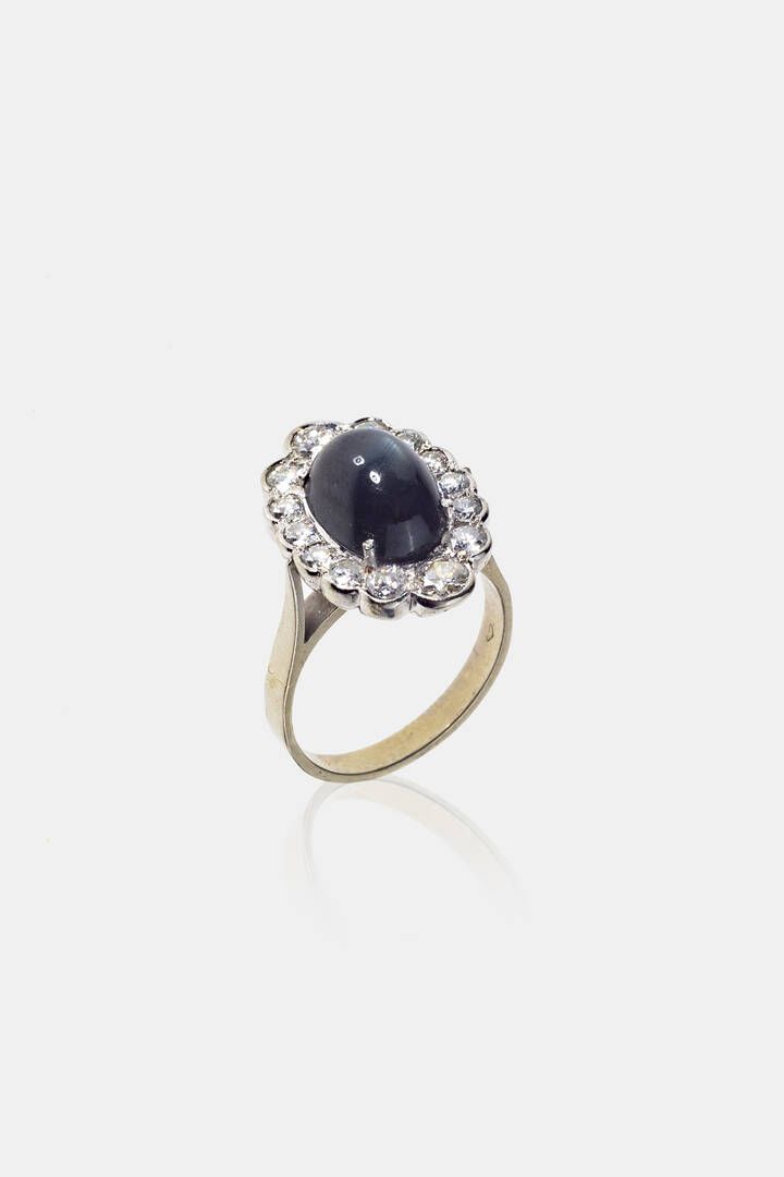 Peso gr 5 5 Misura 13 (53) in oro bianco con al centro zaffiro cabochon stellato di ct 4 30 ca e diamanti taglio brillante per totali ct 0 75 ca