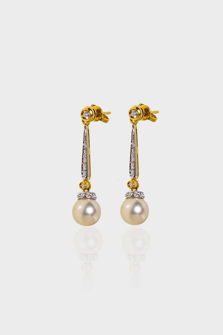 Peso gr 5 5 pendenti in oro giallo con barrette in diamanti taglio brillante per totali ct 0 25 ca terminanti con due perle giapponesi del diam di mm. 8 ca.