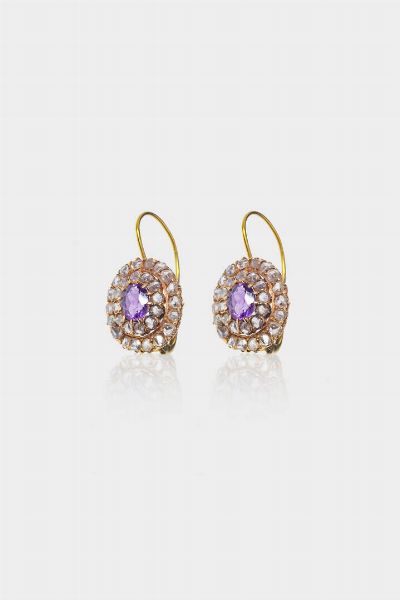 Peso gr 6 3 in oro giallo XIX secolo a monachella con ovali con doppio contorno di rosette per totali ct 1 30 ca e al centro ametiste taglio ovale.