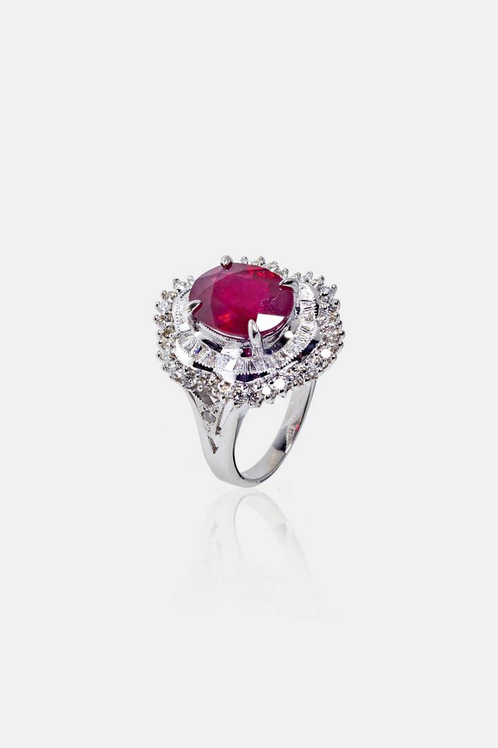 Peso gr 6 6 Misura 14 (54) in oro bianco con rubino centrale trattato taglio ovale di ct 7 0 ca e diamanti taglio trapezio e brillante per totali ct 2 70 ca