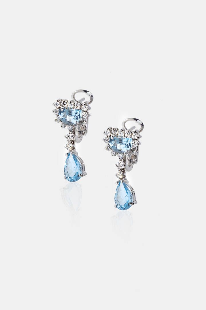 Peso gr 7 0 in oro bianco con acquamarine taglio a goccia e a mezzaluna per totali ct 3 50 ca; diamanti taglio brillante per totali ct 0 60 ca probabile colore G-H purezza IF-VVS