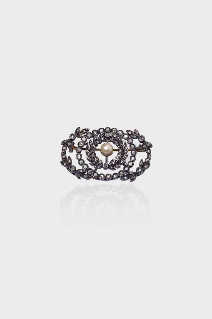 Peso gr 7 2 Cm 2x3 5 in oro a bassa caratura ed argento XIX secolo con al centro perlina naturale del diam. di mm 5 ca e decori a festoni in rosette di diamanti per totali ct 0 50 ca