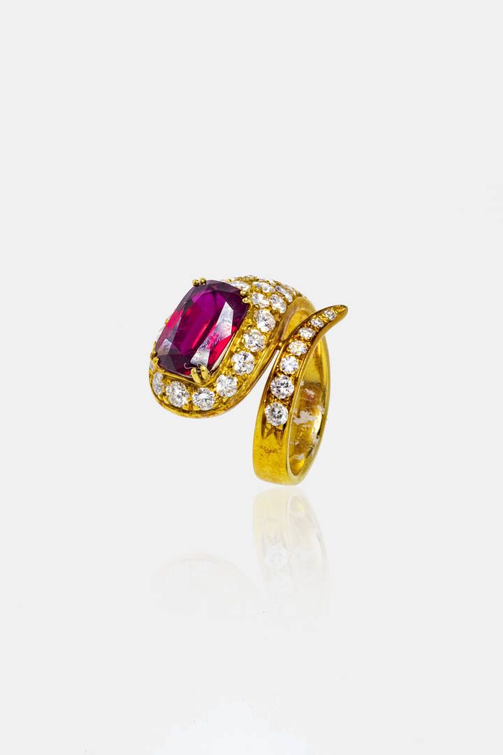 Peso gr 7 4 Misura 5 (45) in oro giallo sommità a serpente con testa e spire in diamanti taglio brillante per totali ct 1 30 ca probabile colore G-H purezza IF-VVS. Al centro tormalina rosa
