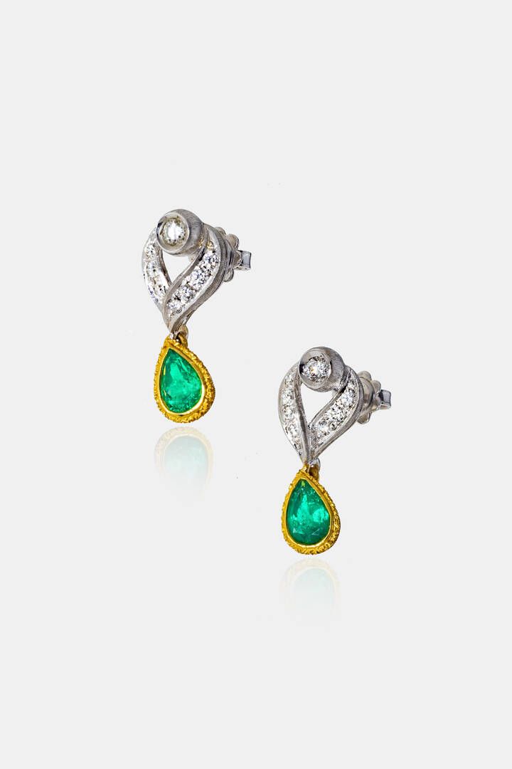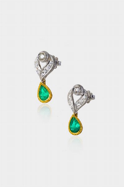 Peso gr 7.7 in oro giallo e bianco con gocce di smeraldi colombiani per totali ct 1 80 ca e diamanti taglio brillante per totali ct 1 50 ca