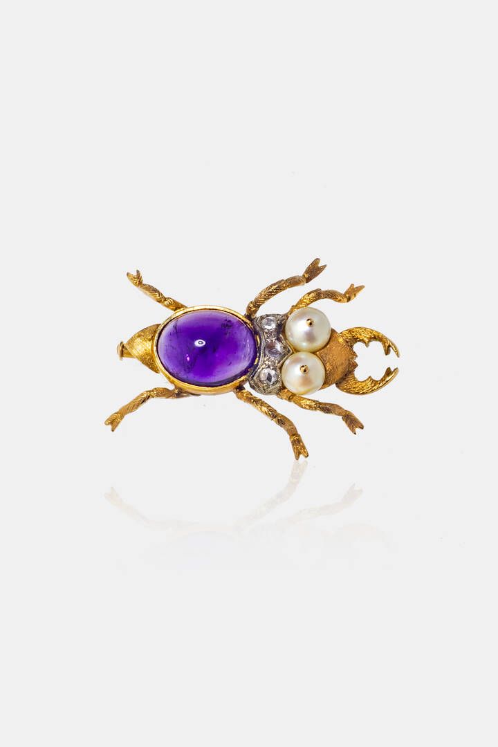 Peso gr 8 3 Cm3 5x2 5 in oro giallo e bianco satinato anni '50 a forma di coleottero: corpo con ametista cabochon; due perle come occhi e rosette coroné per totali ct 0 10 ca a decoro.