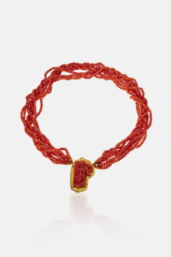 Peso gr 87 3 composto da nove fili di sfere di corallo mediterraneo nei toni del rosso. Chiusura in oro giallo con volto femminile in corallo inciso