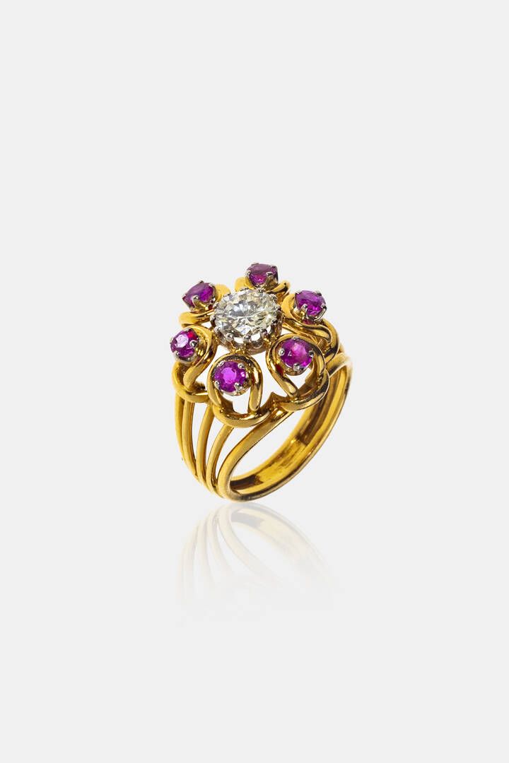 Peso gr 9 4 Misura 14 (54) in oro giallo anni '40 con diamante centrale di ct 0 90 ca e rubini taglio rotondo per totali ct 0 60 ca.