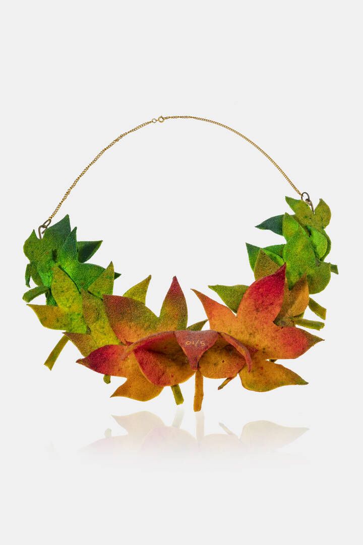 Cm (parte centrale) 20x30 Girocollo firmato Gilardi 1999 es. 5/10 con catena in metallo dorato e parte centrale composta da foglie in poliuretano espanso dipinto