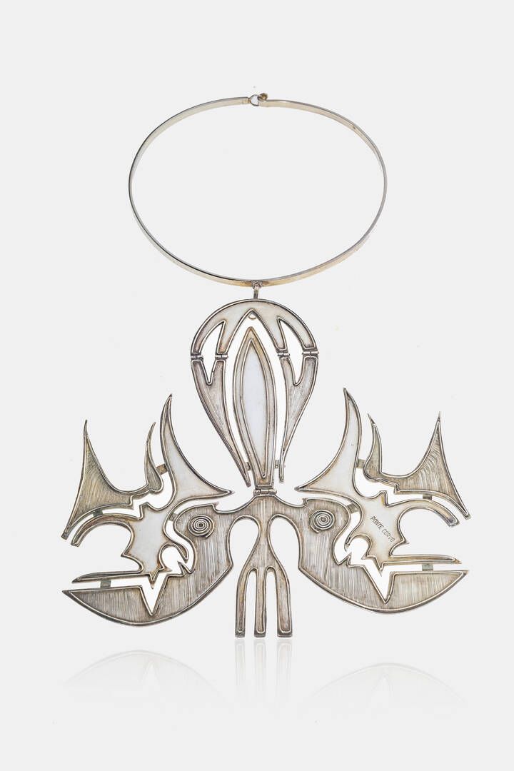 Peso gr 1207 0 Cm 15x13 5 (solo ciondolo) Cm28.5x13 5 complessivo Girocollo in argento 925/1000 firmato Pontecorvo es. 1/3 con grande ciondolo astratto.