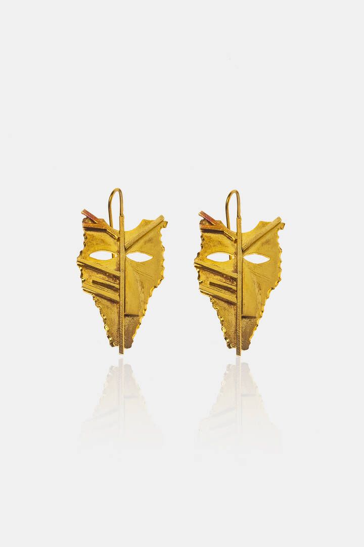 Peso gr 14 3 Cm 4 5X2 Coppia di orecchini pendenti in argento dorato disegnati da Mimmo Paladino a forma di maschera aborigena Provenienza: collezione Franco Mello Prototipo Eseguito dal laboratorio dell'artigiano Mauro Bonafede