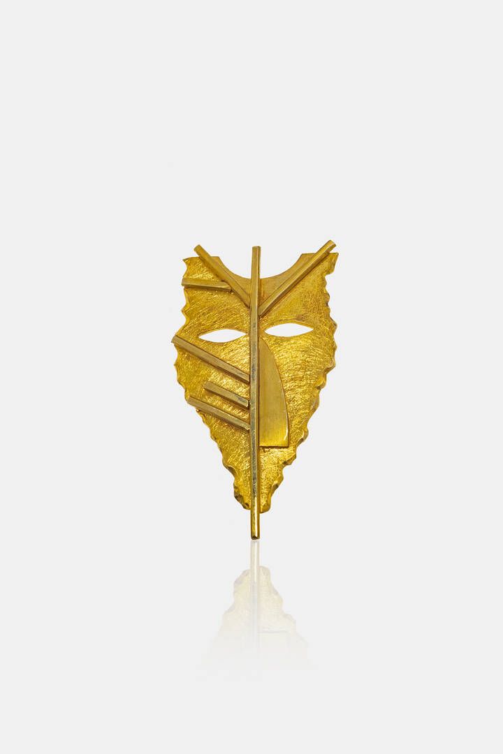 Peso gr 18 4 Cm 6 5X3 5 Spilla in argento dorato disegnata da Mimmo Paladino a forma di maschera aborigena. Provenienza; collezione Franco Mello Prototipo Eseguito dal laboratorio dell'artigiano Mauro Bonafede