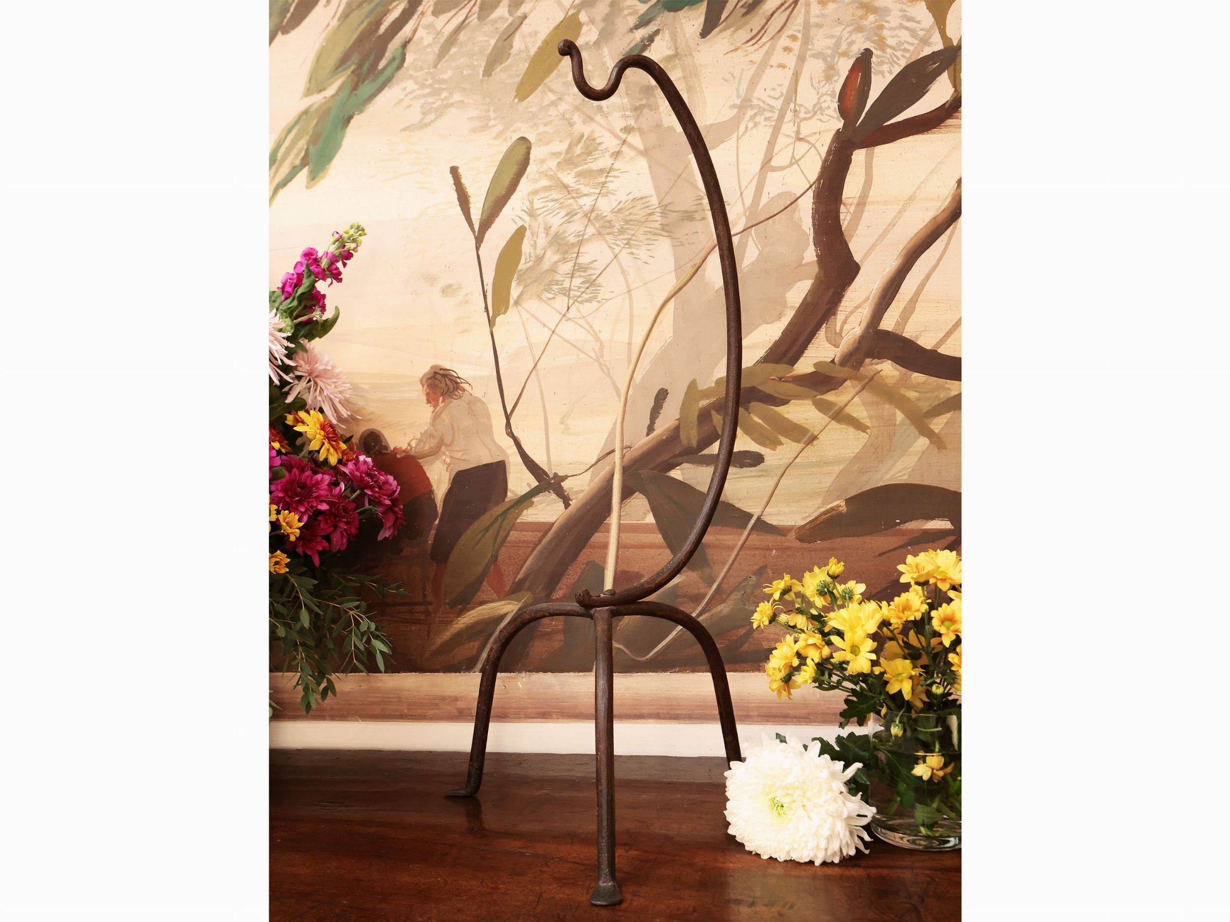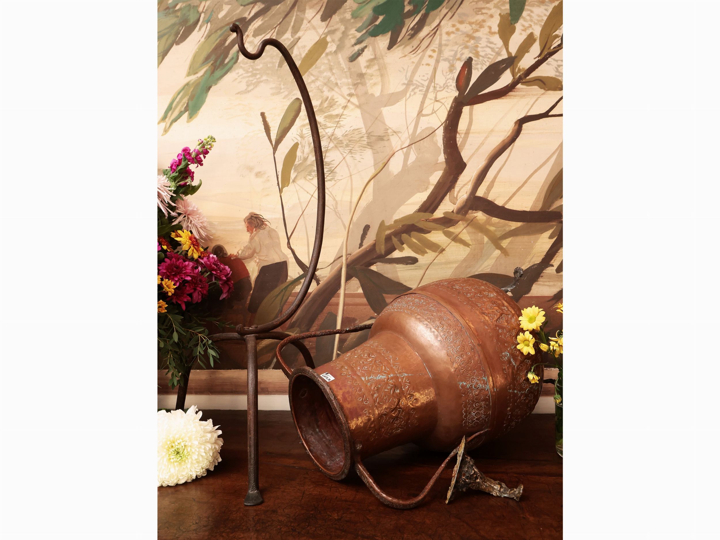 XIX/XX secolo cesellata con motivi floreali stilizzati, tre alti piedi (uno da saldare), su tripode in ferro battuto