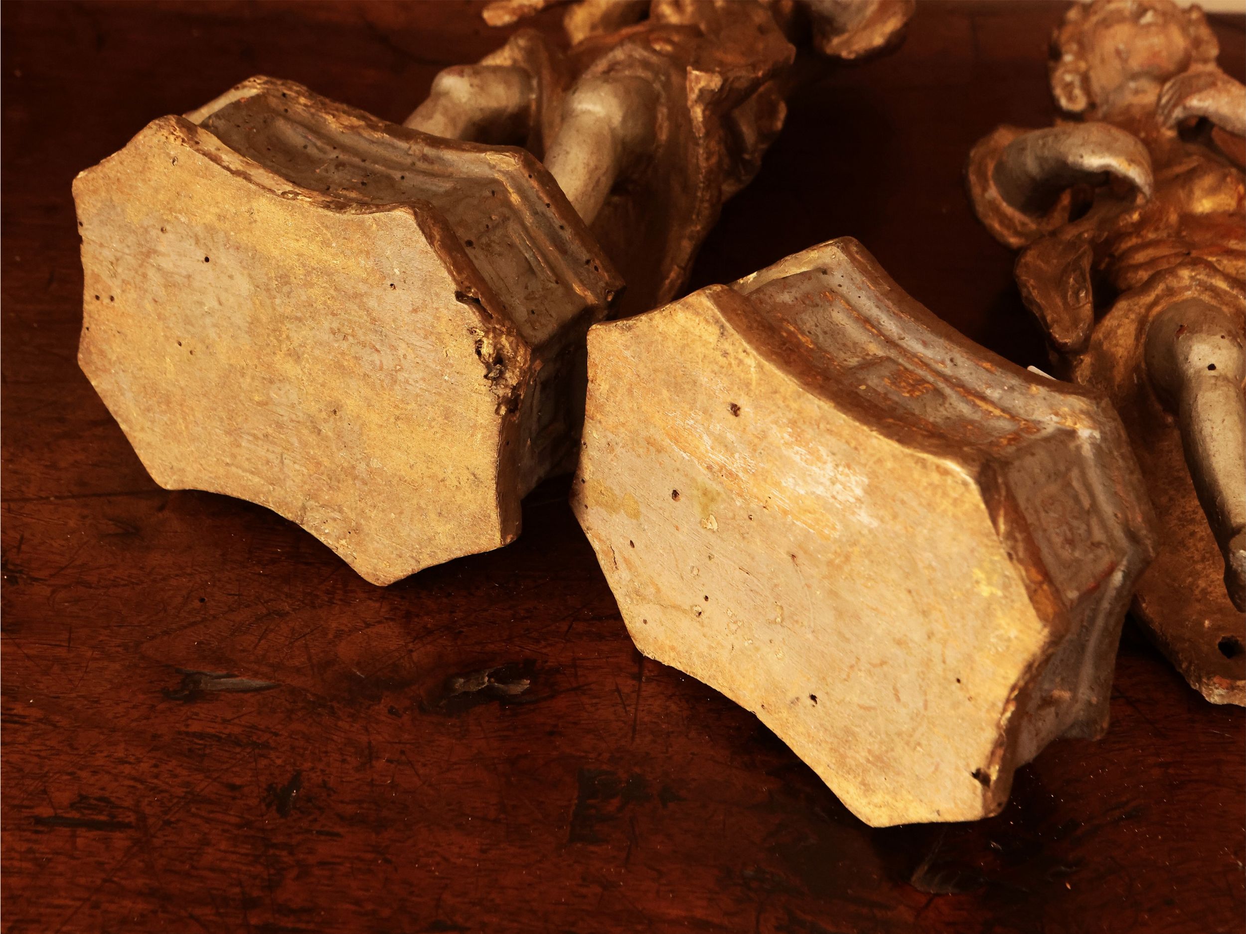 Coppia di angeli portacero in legno intagliato, dorato e argentato