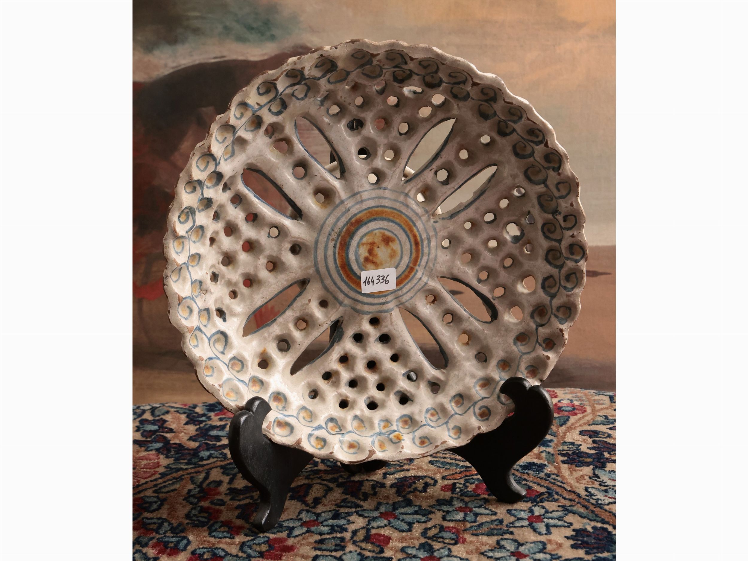 XVIII/XIX secolo dipinta nei toni del blu e del giallo, bordo mosso e corpo traforato, lievi difetti