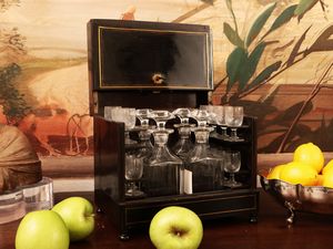 h cm 26x30x22 seconda metà del XIX secolo intarsiata con filettature in ottone, contenente quattro flaconi e sedici [..]