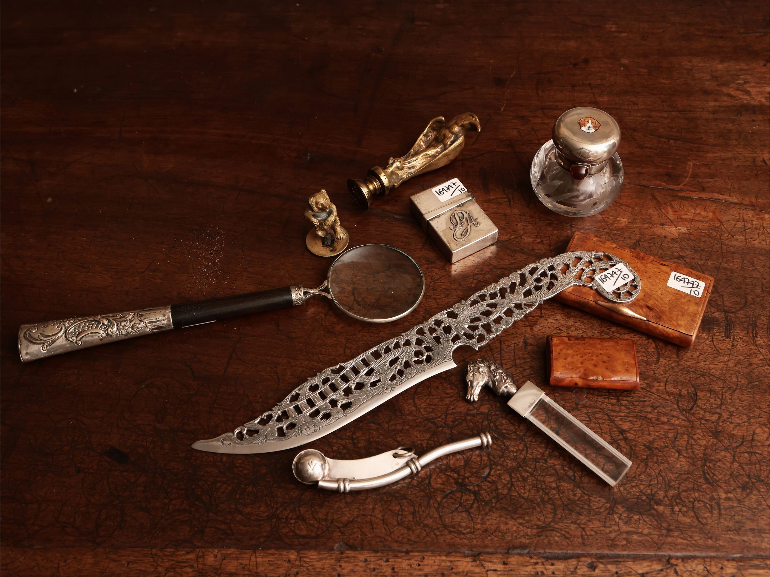 XIX/XX secolo tra cui due sigilli in ottone modellati come animali, un calamaio in argento e cristallo smaltato con testa di cane, una lente di ingrandimento con manico in legno ebanizzato con dettagli in argento, un tagliacarte in metallo argentato interamente traforato con tralci floreali e scritta Pietro Annigoni ed un accendino con le iniziali P.A. (10)