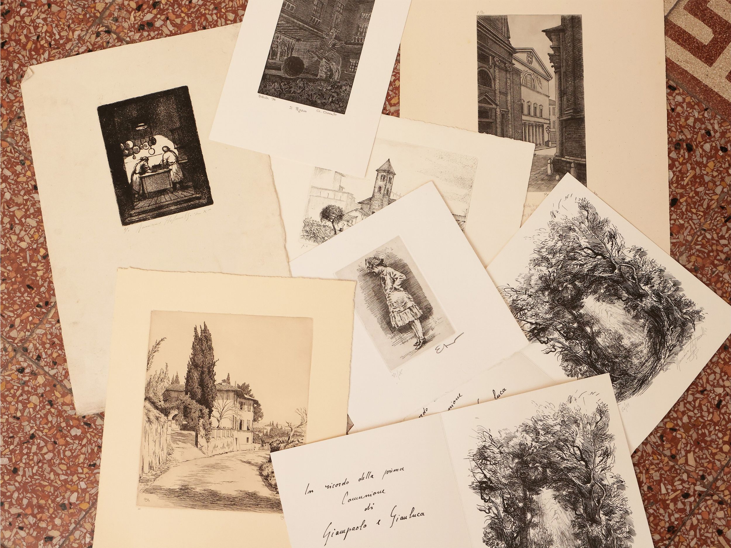 XX secolo C. Ceccato ( XX secolo) Il pegaso 1990, incisione, datata e firmata, cm 29x21; Falani (XX secolo) Senza titolo 1983 p.a. , datata e firmata, cm 25x25; Anonimo (XX secolo) Casolare, incisione, firmata e siglata non leggibile, matrice cm 36x30,5; Romano Stefanelli (1931-2016) coppia di incisioni, es. n. 53/99 e 54/99, firmate foglio cm 29x22; Romano Stefanelli (1931-2016) Massaie in cucina, incisione, firmata, cm 46x30; Ernesto Fuga (XX secolo ) Omaggio a Conconi, acquaforte, es VI/X, firmata, cm 24,5x24,5, corredata di certificato di autenticità dell'autore; Ettore Mossini (XX secolo) Parma il Regio della Steccata 1978, incisione, es. n. 1/20, datata e firmata, reca dedica a Rosella Annigoni, cm 50x34,5