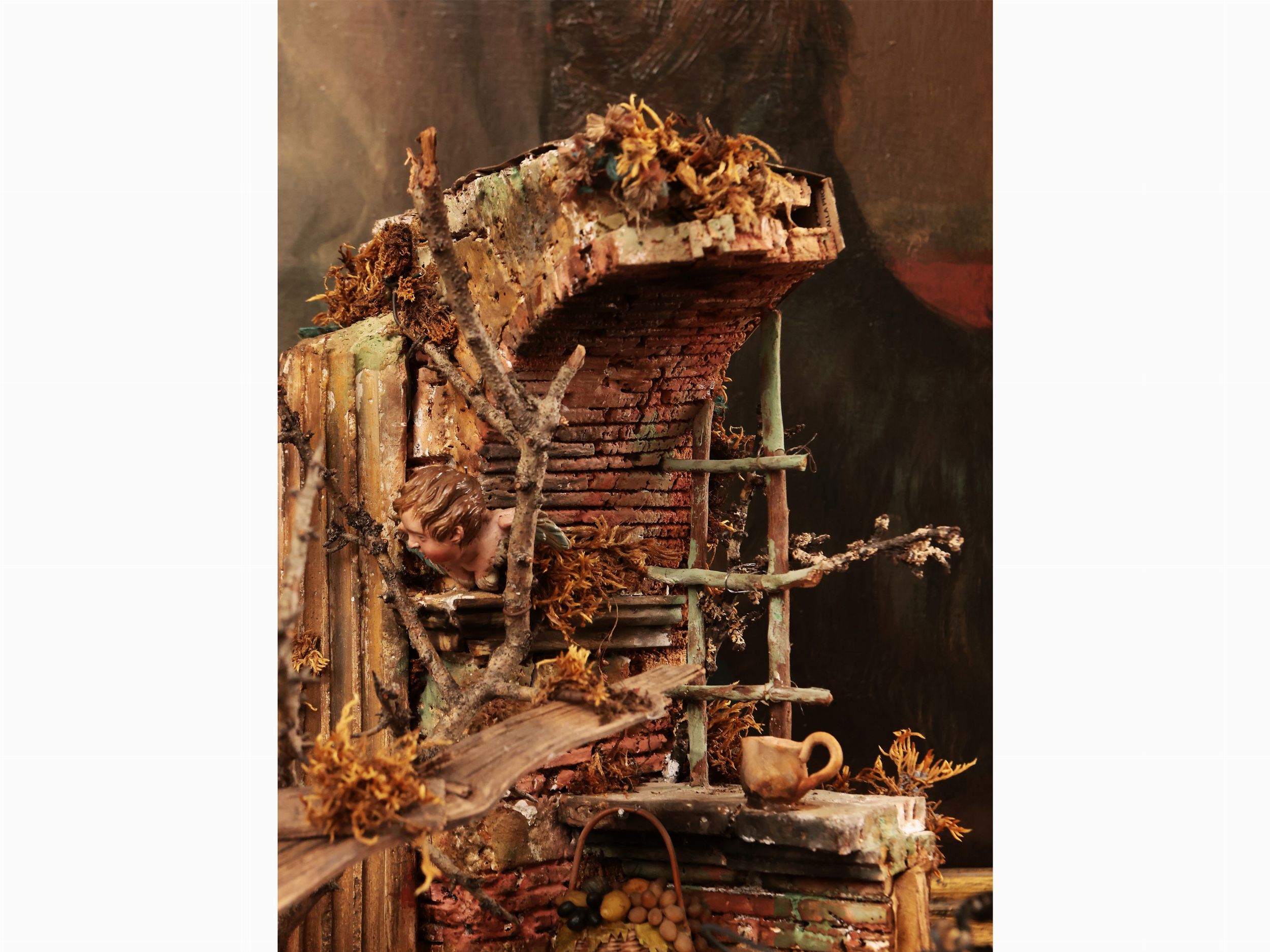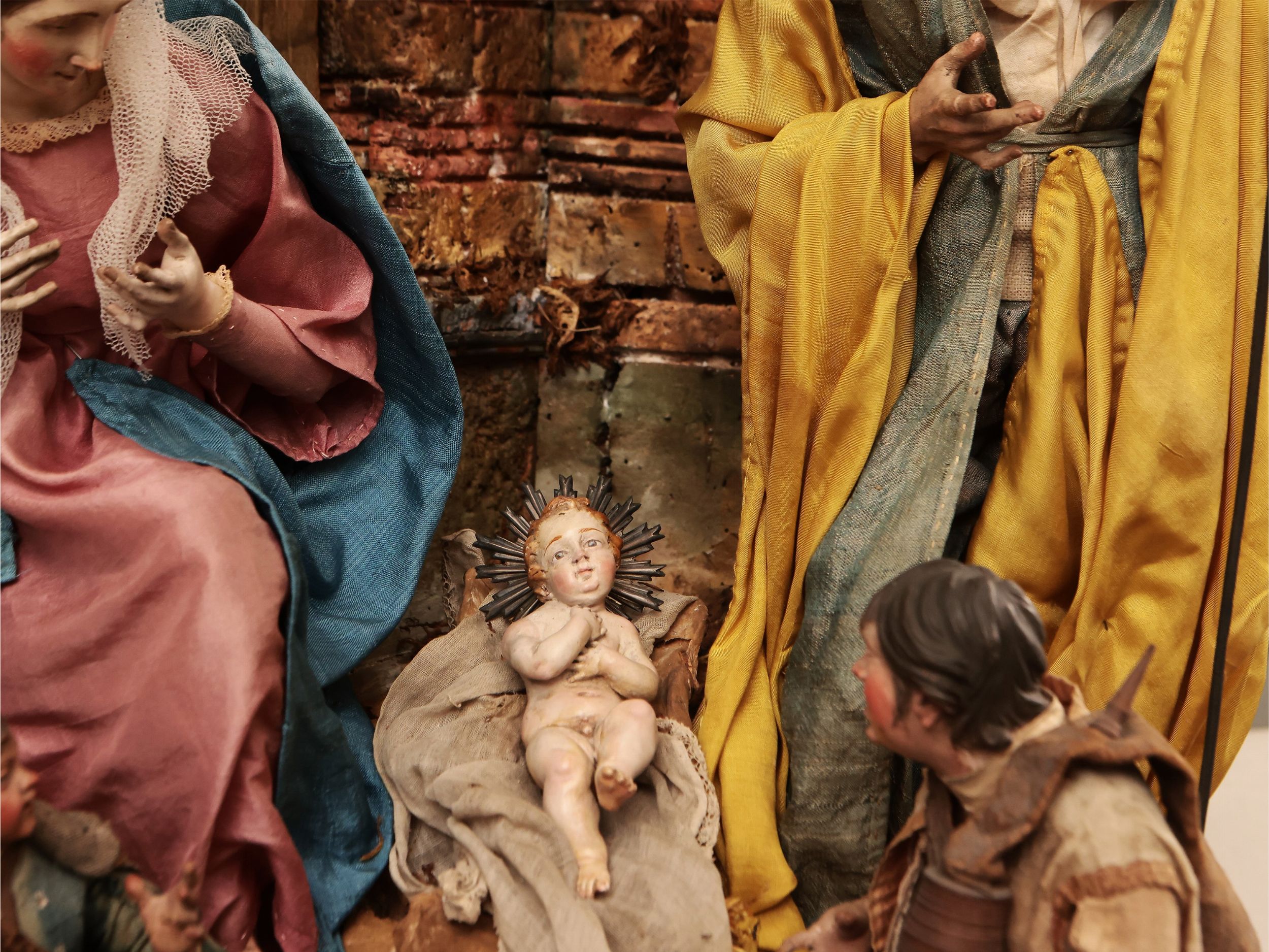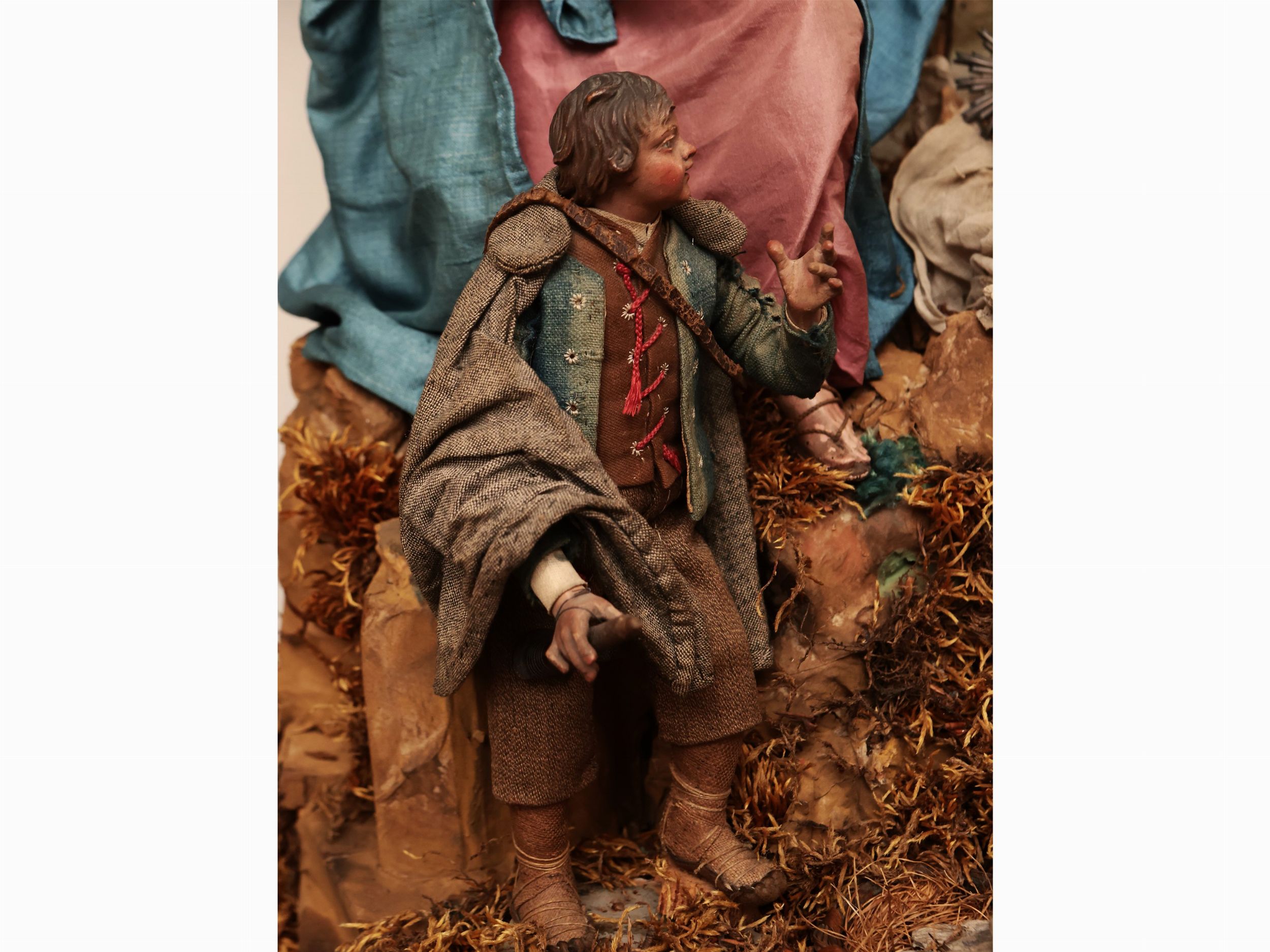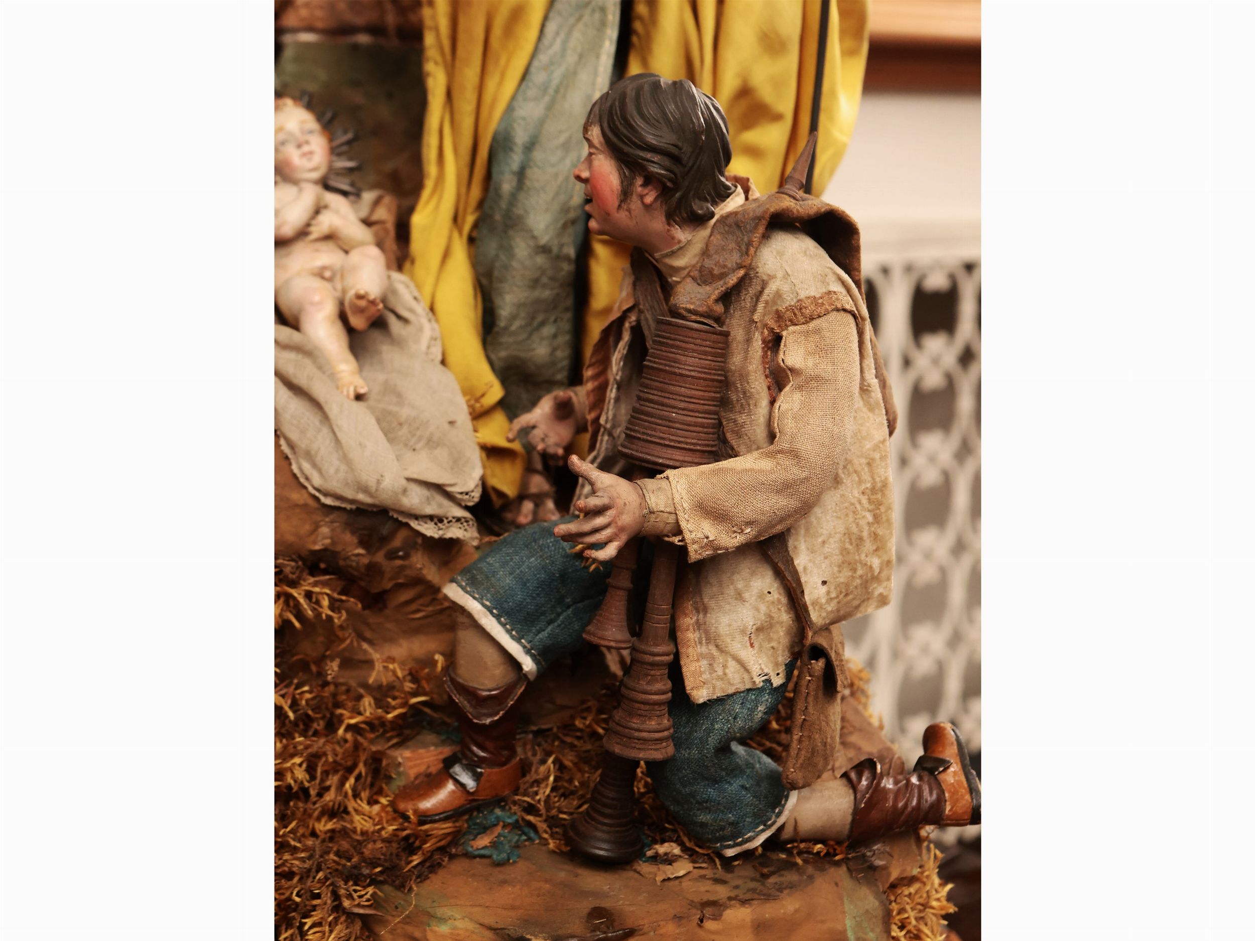Napoli, XVIII/XIX secolo grande presepe realizzato in terracotta dipinta, raffigurante la Sacra Famiglia entro paesaggio con rovine classiche, abiti in tessuti e seta, entro teca a campana