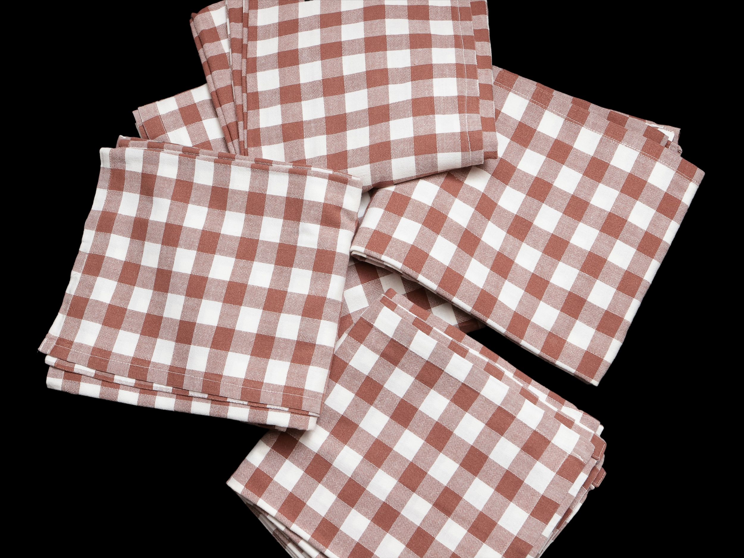 Serie di cinque tovaglie in cotone a quadretti marroni