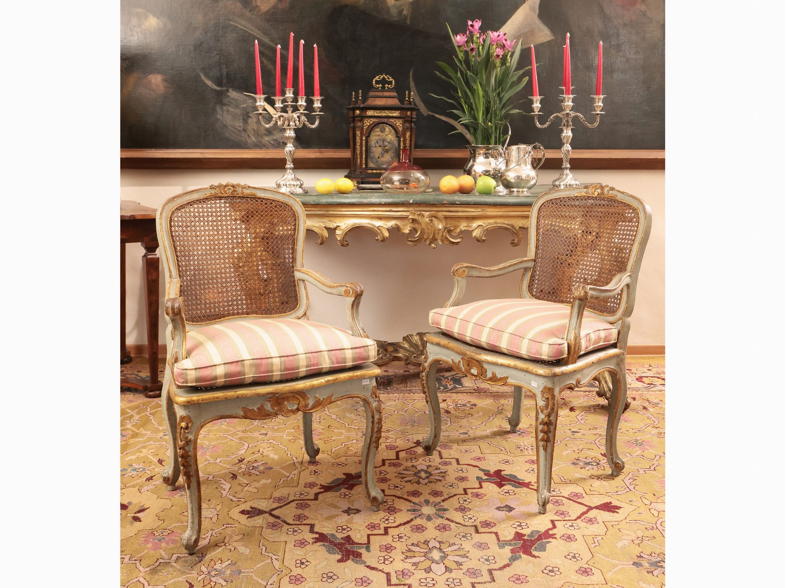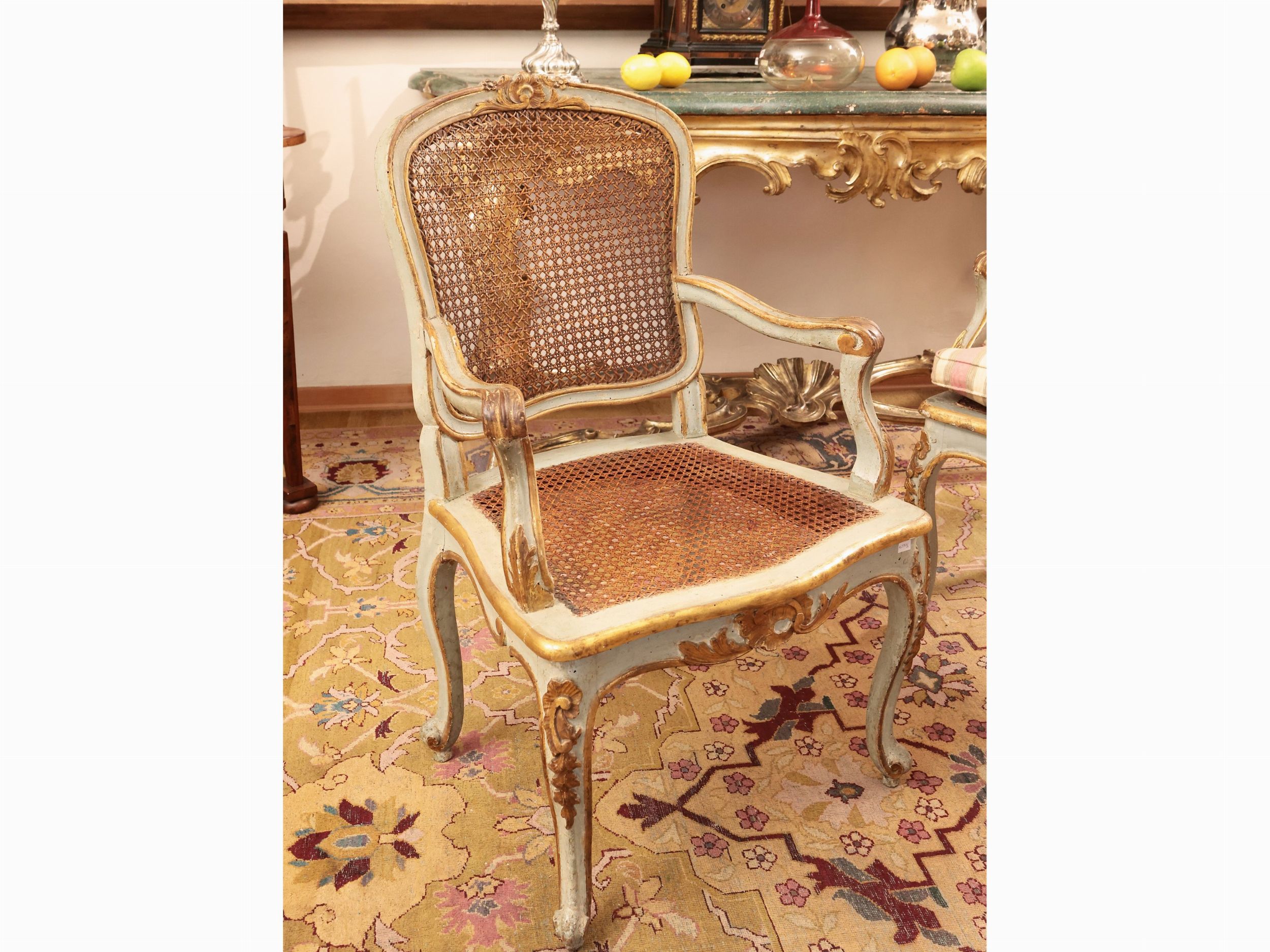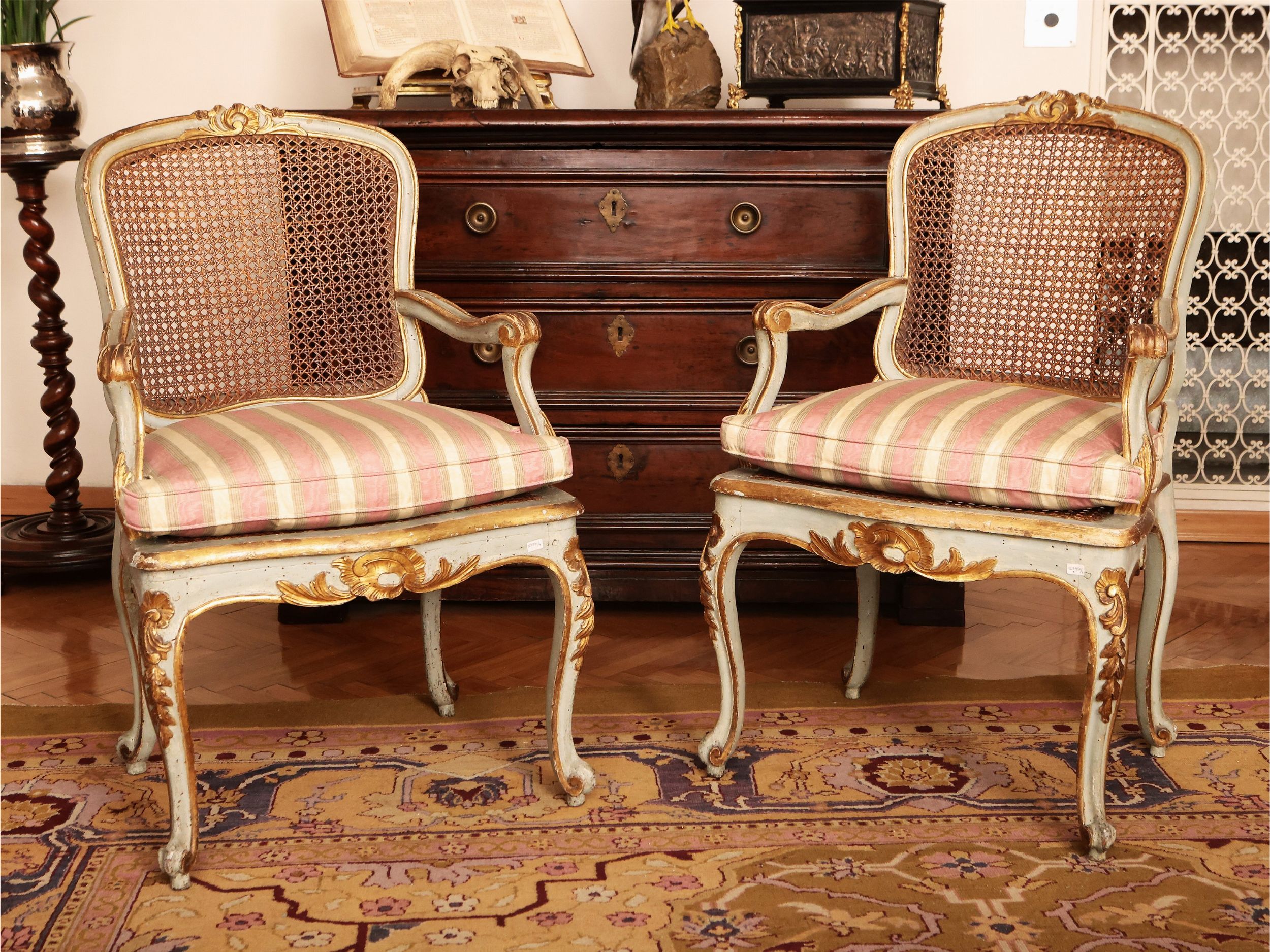 h cm 93x60x51 XVIII secolo lumeggiate in oro, schienale e sedile in paglia di Vienna, braccioli a giorno, gambe leggermente mosse, corredate di cuscini rivestiti in raso nei toni del rosa, alcuni difetti