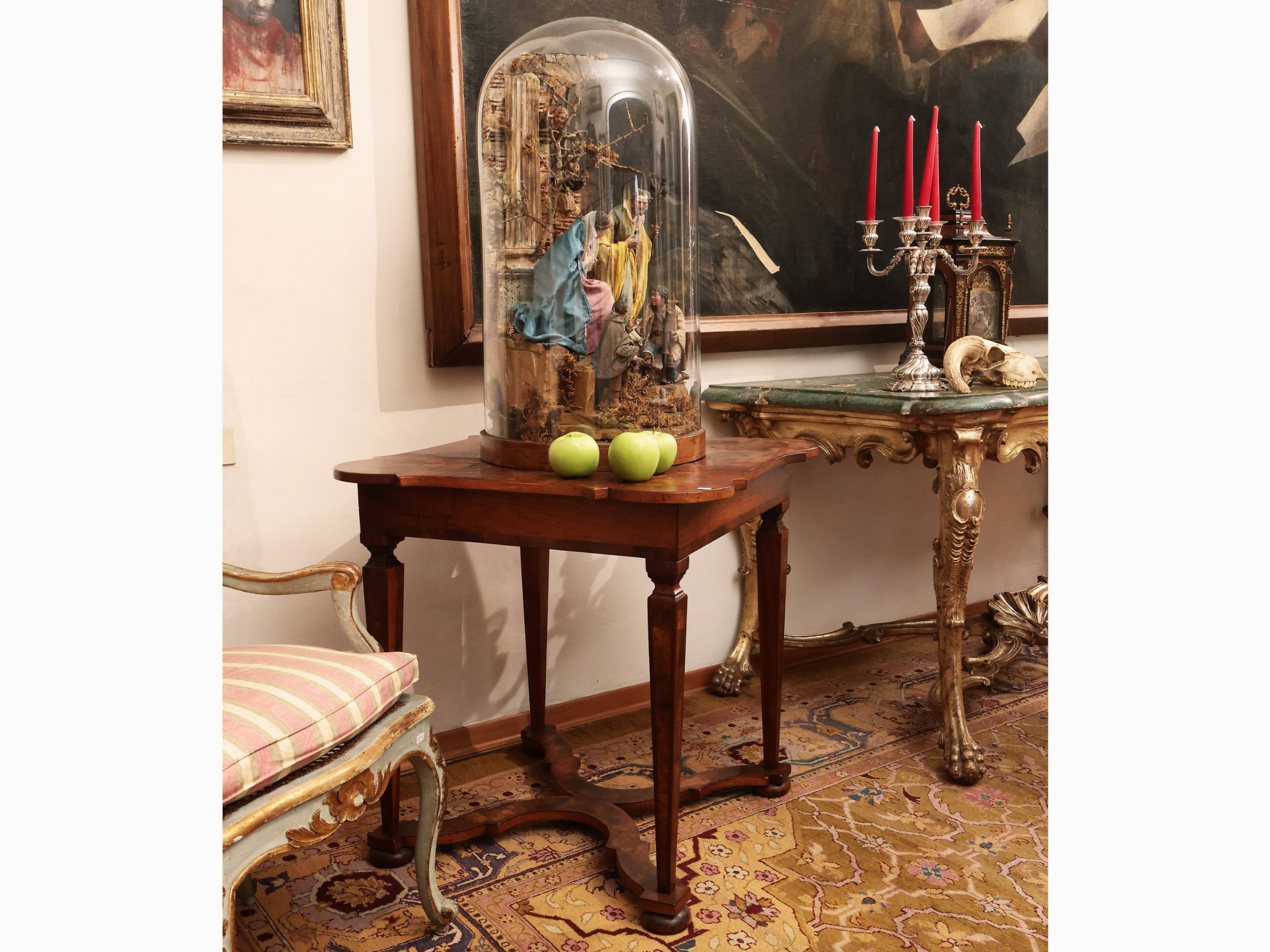 XVIII secolo piano con angoli arrotondati, gambe a faretra riunite da traversa a crociera