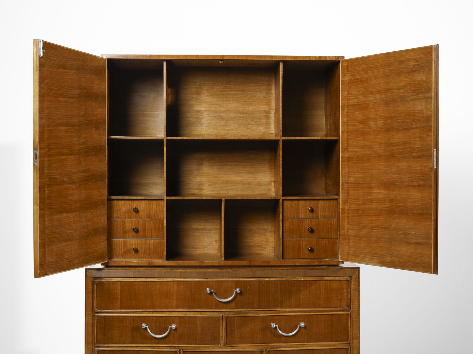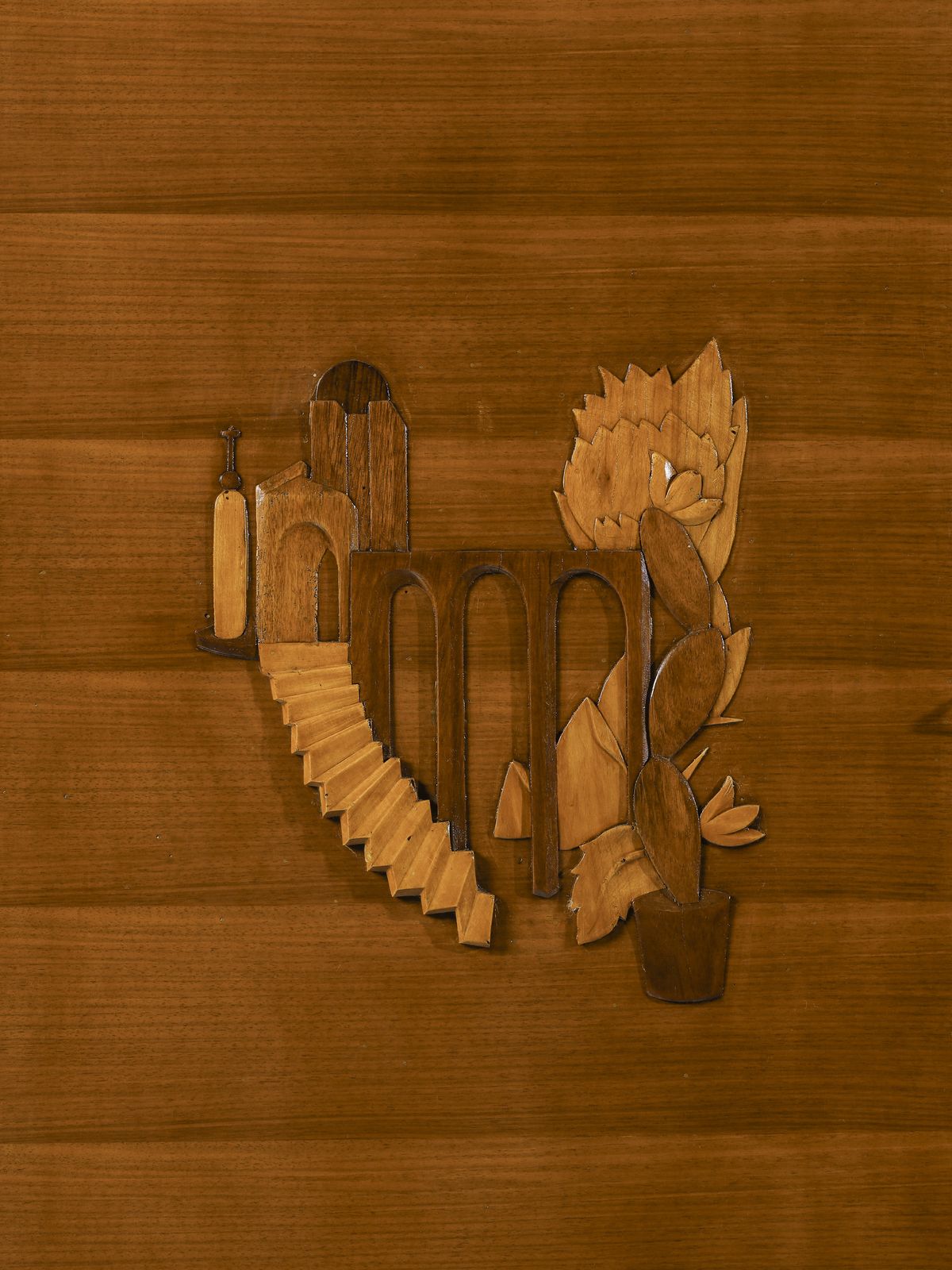 Credenza ad ante e cassetti con intagli applicati a soggetto architettonico esecuzione [..]