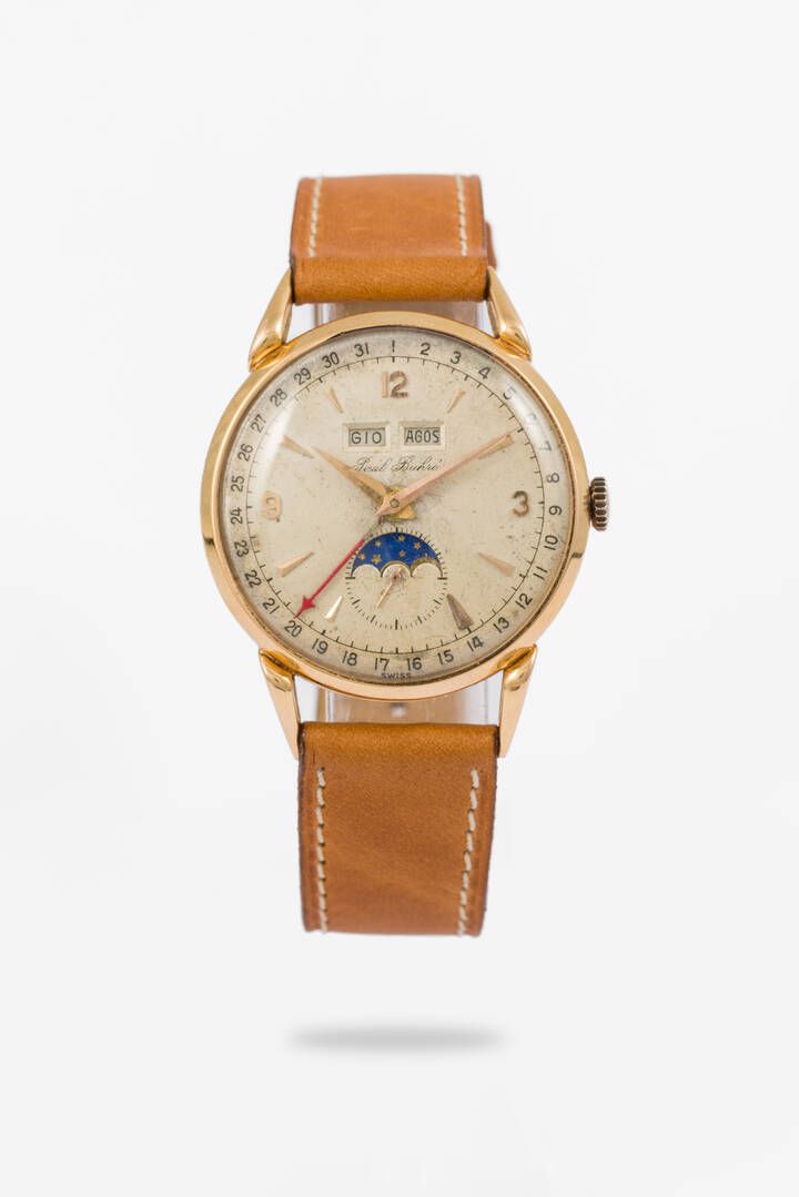 Diam. 35 mm Cassa in oro rosa con anse a ragno e fondello a scatto. Quadrante argento con indici geometrici applicati e numeri arabi ai quarti. Fasi lunari concentriche al 6 con l'indicazione dei secondi continui. La funzione calendario dell'orologio mostra la data serigrafata in blu ai limiti del quadrante tramite la lancetta rossa ed il giorno e il mese dell'anno tramite le due apposite finestrelle poste ad ore 12. Movimento a carica manuale firmato. In ottimo stato conservativo.