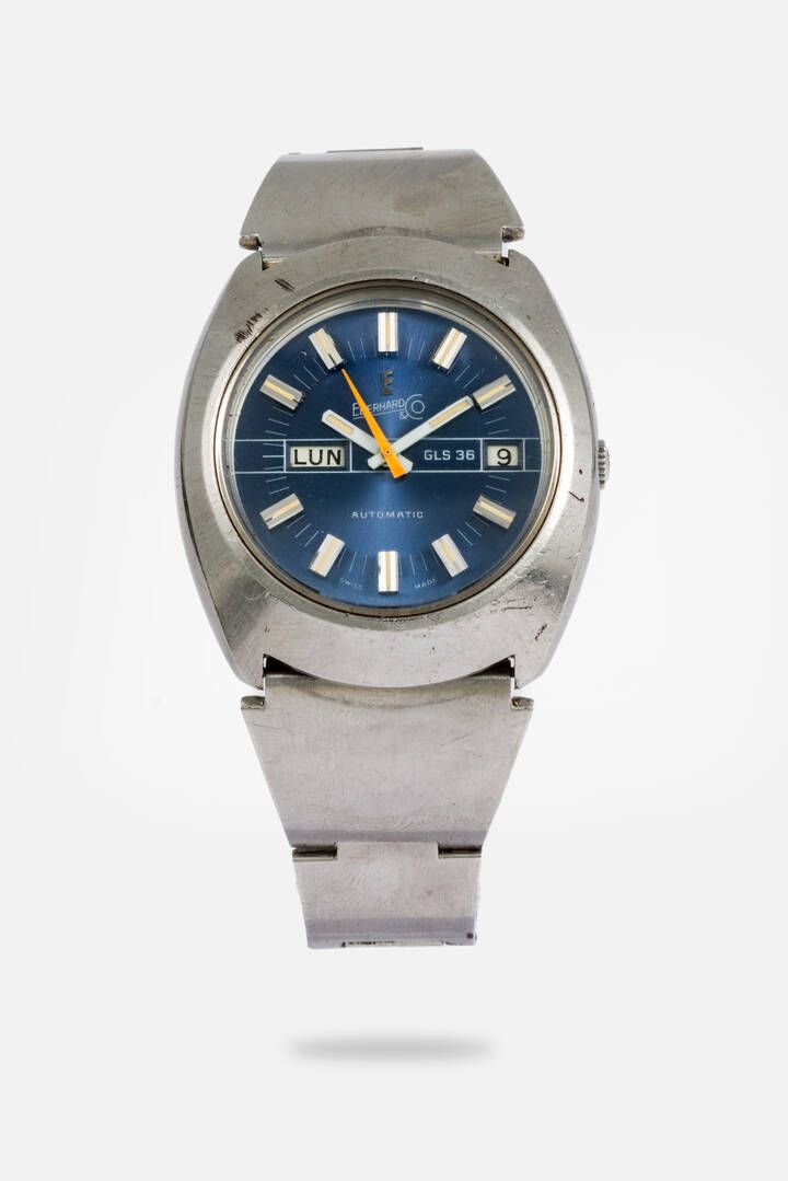 Diam. 38 mm Cassa in acciaio con fondello a vite. Quadrante blu soleil con indici geometrici applicati indicazione della data al 3 e del giorno della settimana al 9. Movimento a carica automatica cal. 368. Da revisionare.