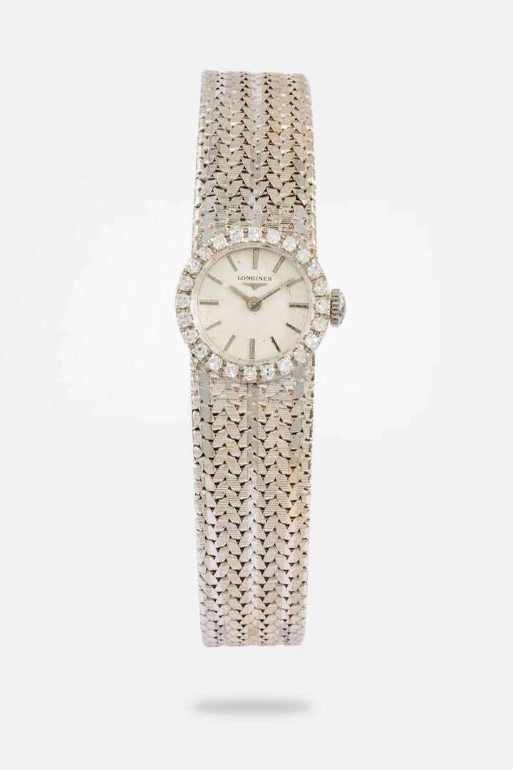 Diam. 18 mm Cassa in oro con fondello a scatto e lunetta di diamanti. Quadrante grigio con indici geometrici applicati. Bracciale integrato in oro con chiusura a scomparsa non firmata. Movimento a carica manuale.