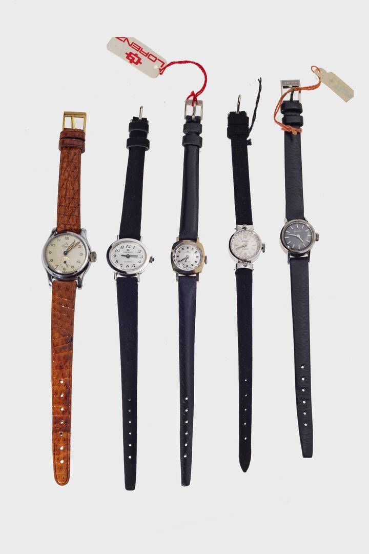 Diam. da 17 a 26 mm Orologi di vari marchi (Zenith Perseo Lorenz Imperios). Casse di varie dimensioni e forme in acciaio. Quadranti argento/grigio con indici e numeri applicati. Movimenti a carica manuale da revisionare.