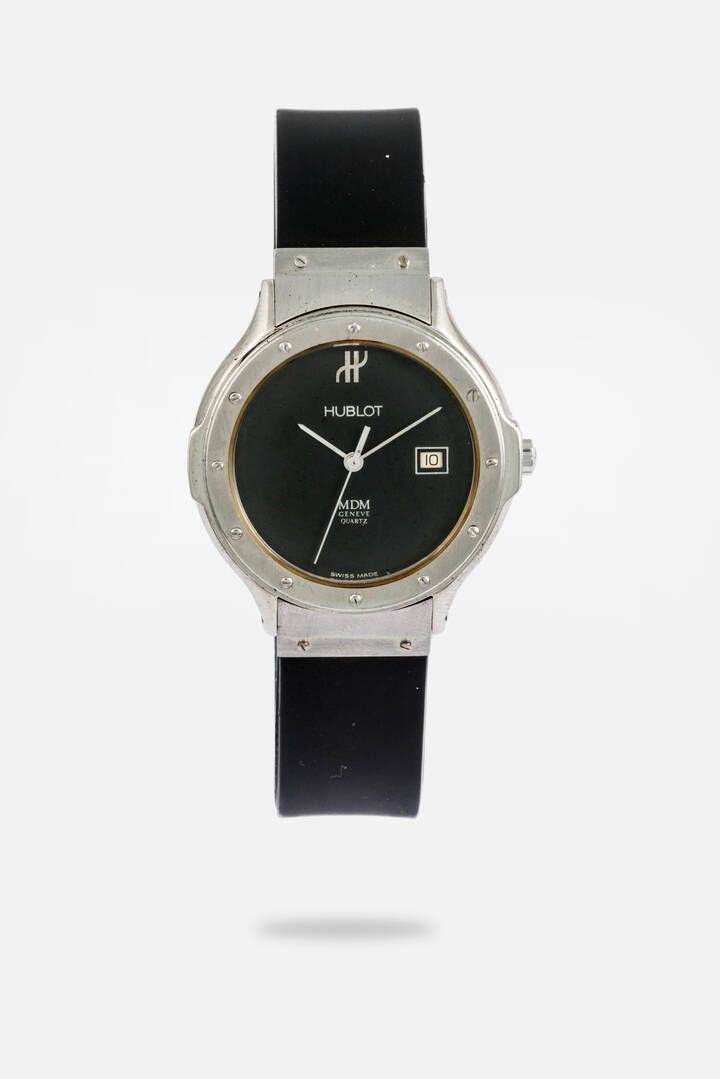 Diam. 32 mm Cassa in acciaio con fondello e lunetta avvitati. Quadrante antracite con datario al 3. Bracciale in gomma con chiusura deployante marchiata Hublot. Movimento al quarzo. Orologio in ottimo stato di conservazione corredato di scatola.