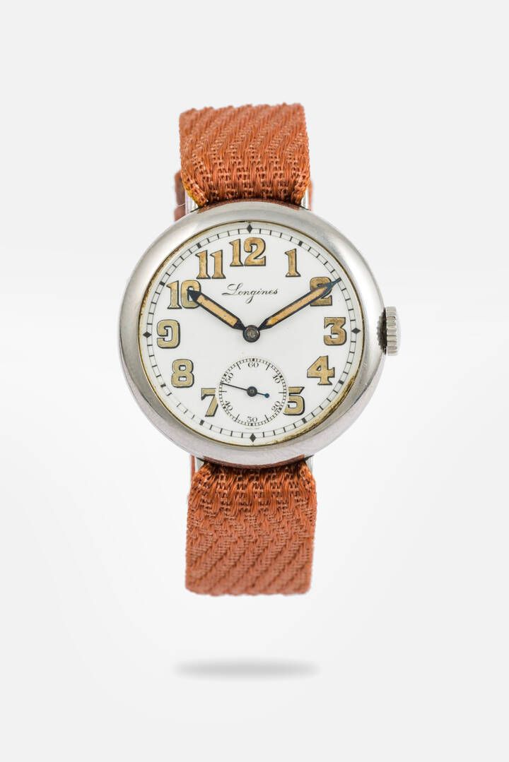 Diam. 35 mm Cassa metallica con doppio fondello a cerniera. Quadrante in smalto bianco con numeri arabi luminescenti al radio e contatore dei secondi continui al 6. Movimento a carica manuale cal.13.34ZZ. Certificato di originalità ed autenticità Longines. Orologio donato il 20 Agosto 1921 alla Sociètè des sous-officiers de Saint-Imier.