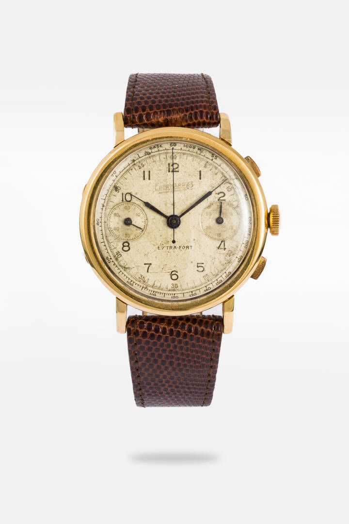 Diam. 39 mm Cassa in oro con fondello a cerniera (cassa storta in prossimità di un'ansa). Quadrante argento con patina vintage e numeri arabi serigrafati. Presente al 9 l'indicatore dei secondi continui e al 3 quello dei minuti cronografici.
