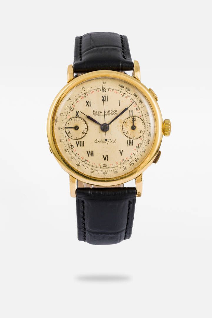 Diam. 39 mm Cassa in oro con fondello a cerniera (cassa storta in prossimità di un'ansa e presenza di una saldatura in prossimità di un'altra ansa). Quadrante argento ristampato con patina vintage e numeri romani serigrafati. Presente al 9 l'indicatore dei secondi continui e al 3 quello dei minuti cronografici. Movimento a carica manuale cal. 16000 da revisionare (parte mancante).