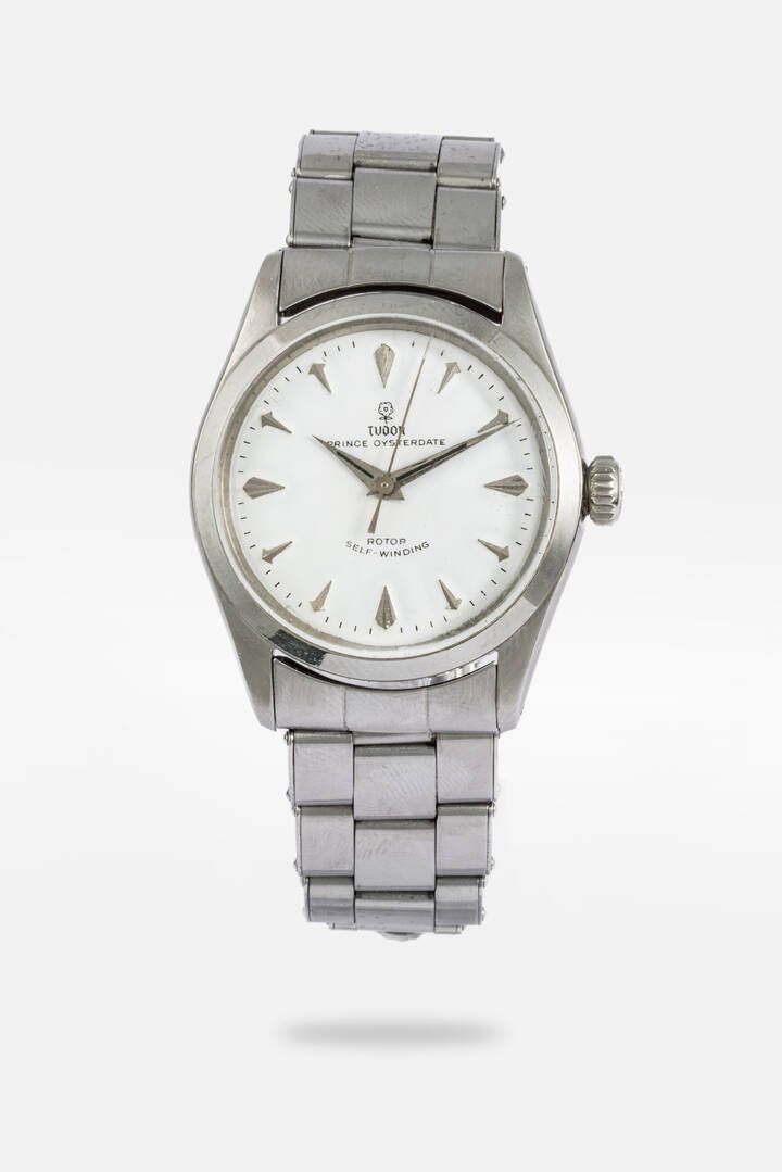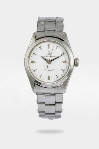 Diam. 34 mm Cassa in acciaio con fondello a vite. Quadrante bianco con indici geometrici applicati e indicazione centrale dei secondi continui. Bracciale marchiato Rolex ripiegato ref. 7205 con finali ref. 60. Movimento a carica automatica marchiato.