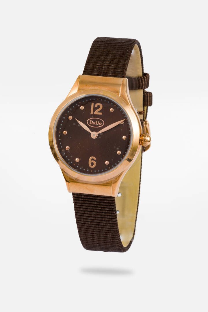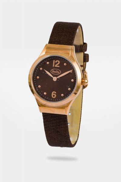 Diam. 28 mm Cassa placcata oro rosa con fondello in acciaio; lunetta liscia. Quadrante color bronzo con indici geometrici e numeri arabi al 12 e al 6. Bracciale in tessuto color bronzo. Movimento al quarzo.