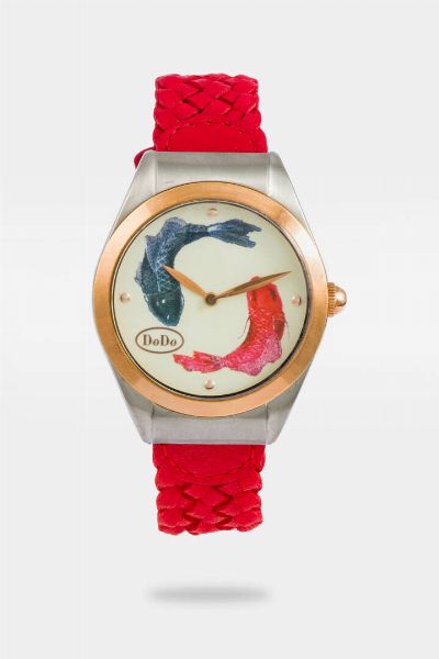 Diam. 34 mm Cassa in acciaio con lunetta e corona in oro 9 Kt. Quadrante con due pesci ed indici geometrici ai quarti. Bracciale in pelle intrecciata rossa. Movimento al quarzo