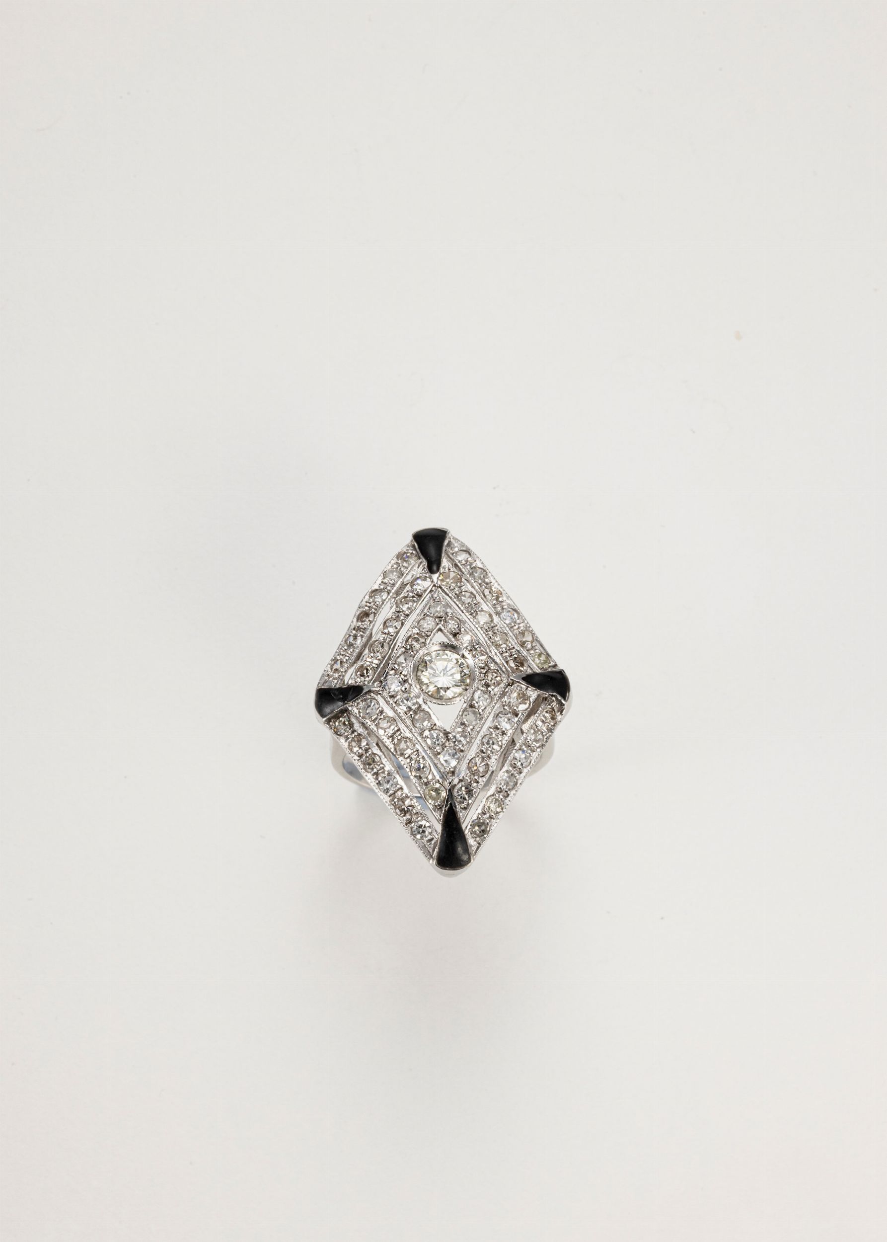 Diamante centrale taglio brillante, pavé di diamanti taglio huit-huit, onici ai quattro angoli, oro 18 kt, diamanti ct 0,90 ca., misura 18, g 10,50 ca.