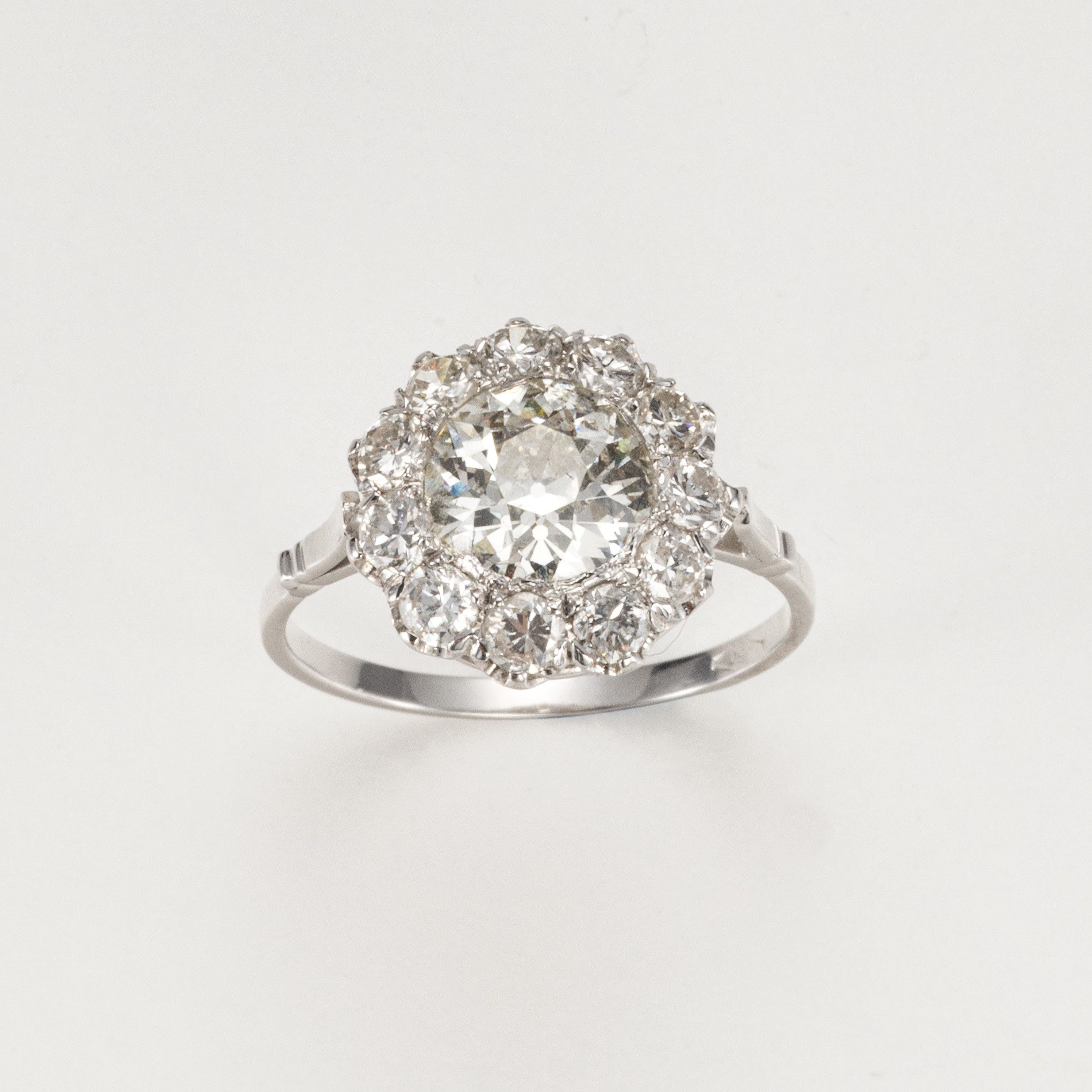 Diamante centrale vecchio taglio europeo ct 2,65 ca., corolla di diamanti taglio brillante ct 1,00 ca., misura 18, g 3,30.
