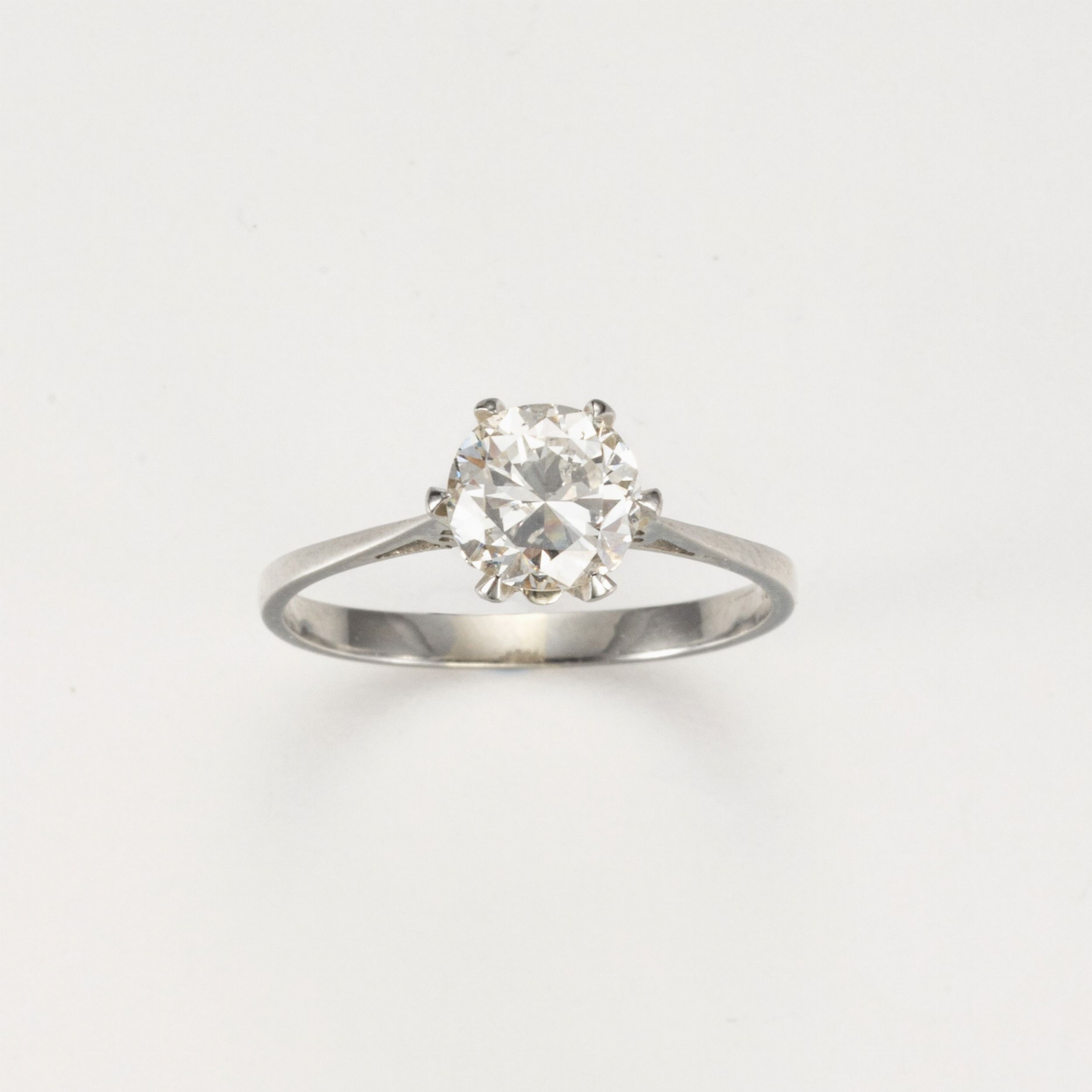 Montatura a solitario, oro 18 kt, diamante ct 1,30 ca., colore L, purezza SI2, misura 19, g 2,50.
