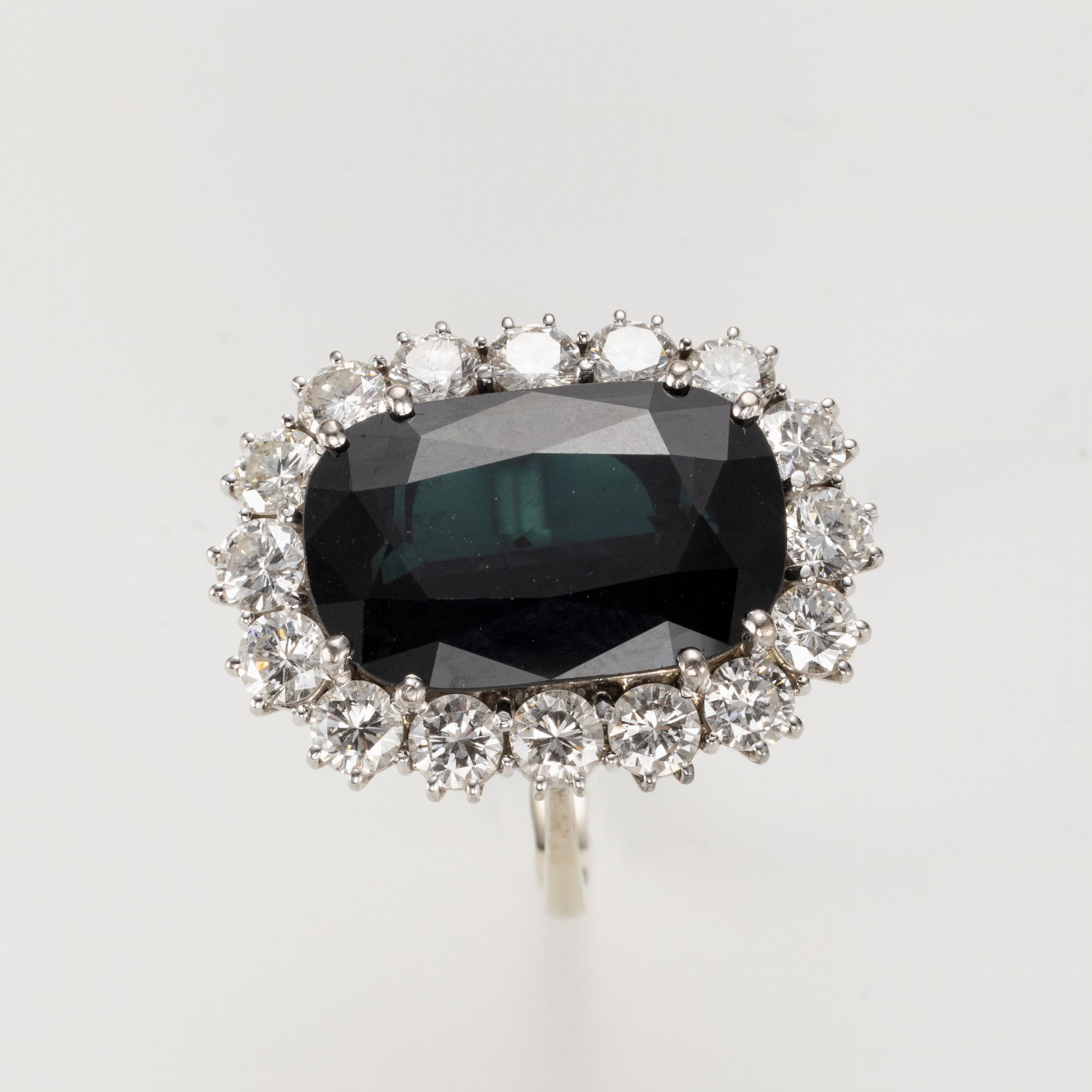 Grande zaffiro australiano taglio ovale al centro entro una cornice di diamanti taglio brillante, oro 18 kt, zaffiro ct 2,81 ca., diamanti ct 1,80 ca., misura 16, g 8. Misure prese sotto la limitazione imposta dalla montatura.