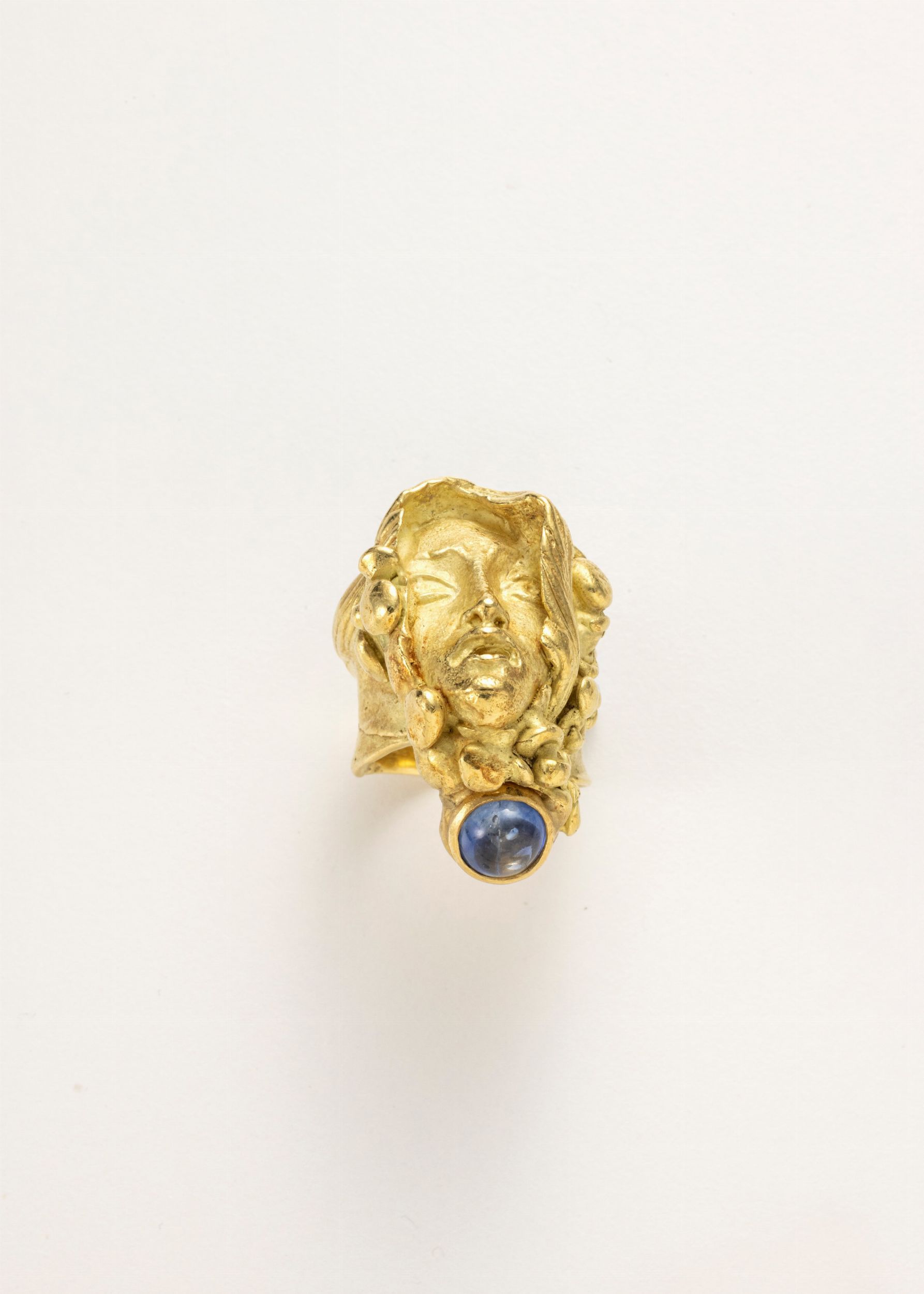 Volto femminile in rilievo, zaffiro cabochon, design arch. Fallani, oro 18 kt, zaffiro ct 0,75 ca., g 35.
