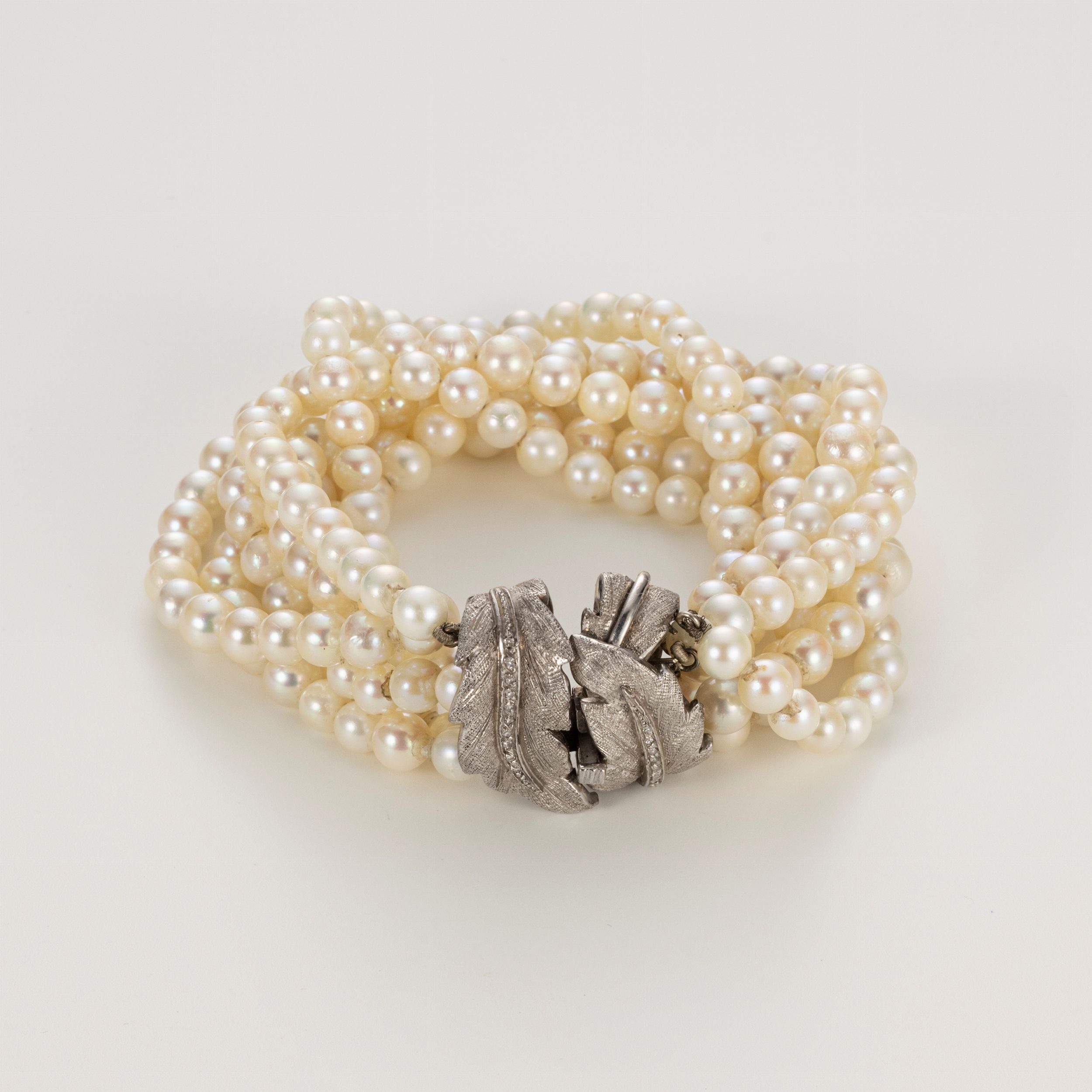 Chiusura in oro bianco a motivo di foglie con piccoli diamanti, oro 18 kt, lunghezza cm 16, perle mm 5 ø.
